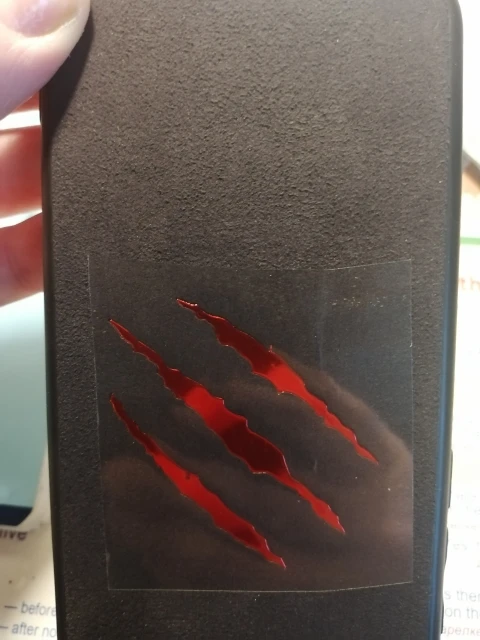 Он просто офигенный, как мягенькая кошечка в руках, и снимать не хочеться, очень крутой, и красные царапины идеально подошли к цвету телефона, но есть одно но, он не заходит на екран, но хорошо прикрывает камеру и отпечаток.