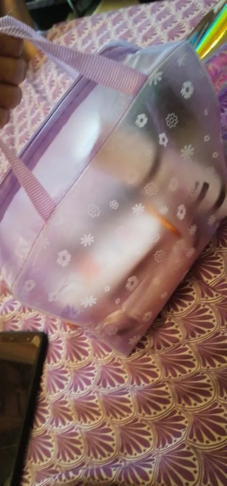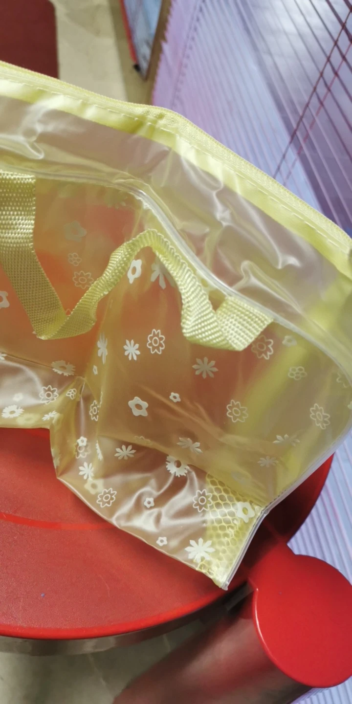 Exactamente como sale en la foto, el plástico es fino pero para neceser ya es suficiente, cremallera perfecta, lo he llenado y soporta peso.