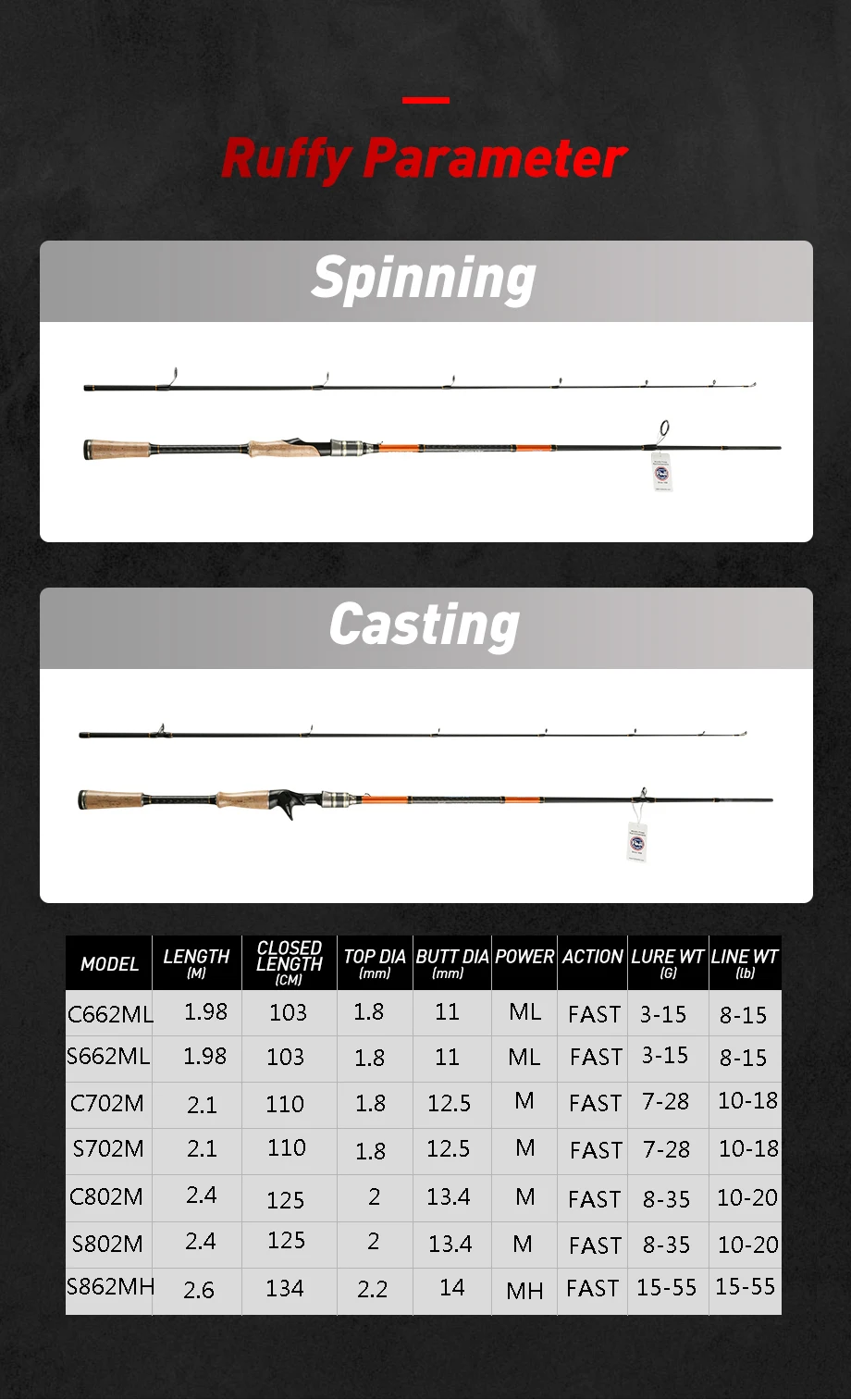 Отзыв по C662ML: с виду очень хорошо сделан спиннинг. Тест заявлен как 3-15, но реальный будет где то 21гр (как на воде испробую, так дополню). Строй фастовый. кольца фуджи все. По крайней мере два первых точно, так как гравировка есть. Остальные такие же по качеству, просто там места нет куда гравировку фуджи сунуть))