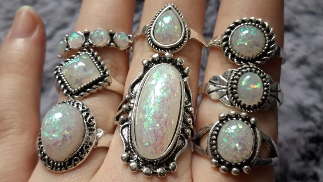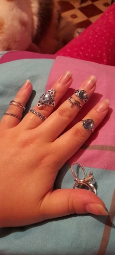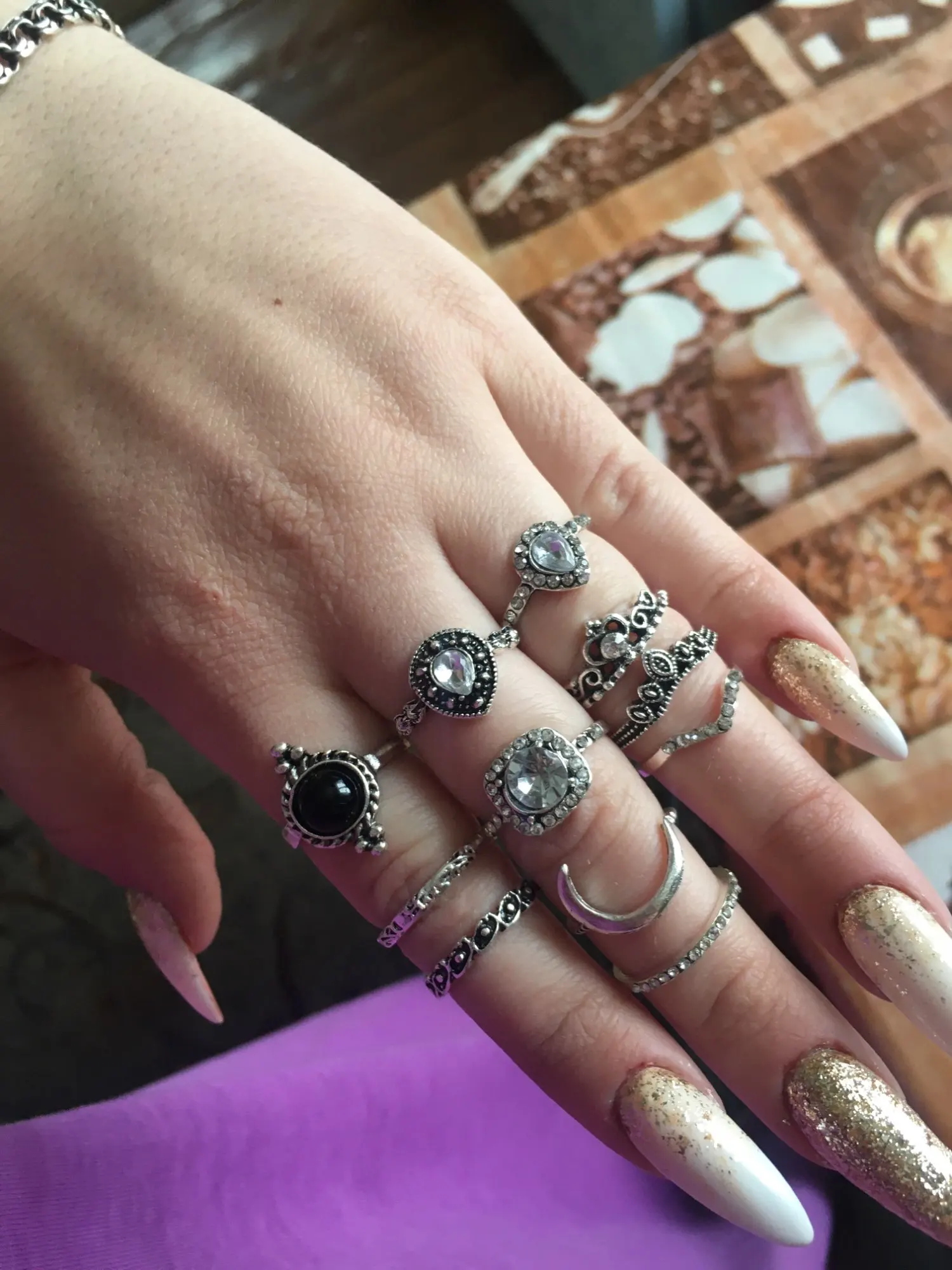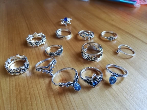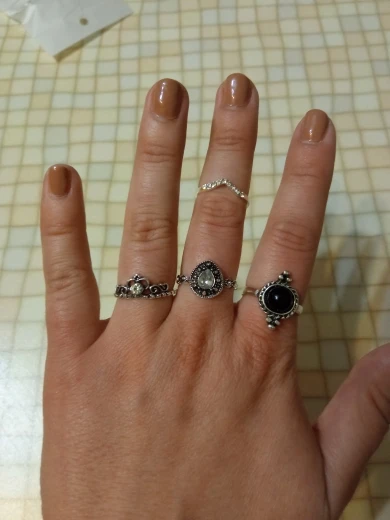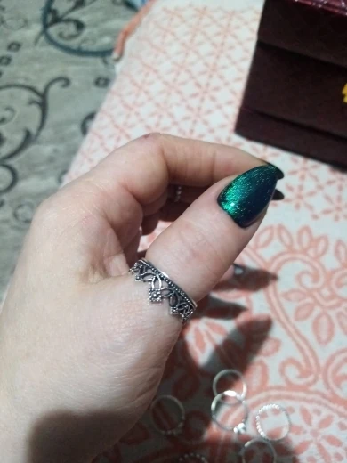 Очень жаль, что почти все кольца для верхней фаланги велики, а для нижней малы (ношу 16,5 размер). Но кольца красивые. Цвет камня немного не соответсвует фото, но мне нравится. Сами кольца тоже не такие аккуратные как на фото, но за эти деньги все супер, даже прилагался мешочек для колечек.