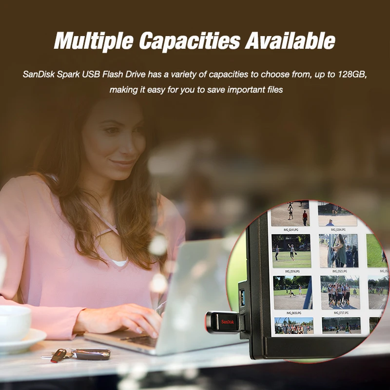 Флеш-накопитель USB Cruzer Spark доступен емкостью до 128 Гб *, что позволяет сохранять нужные вам файлы и контент, который вам нравится.