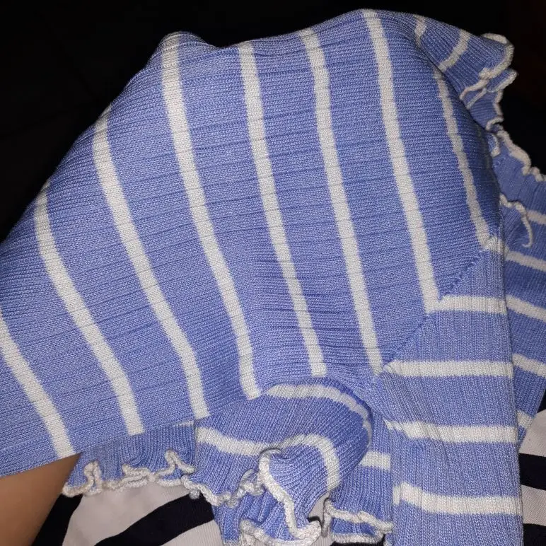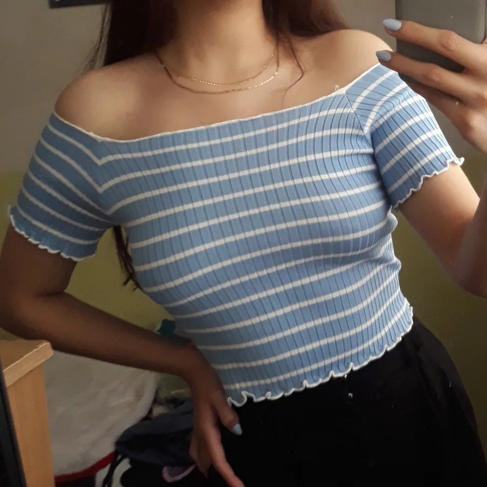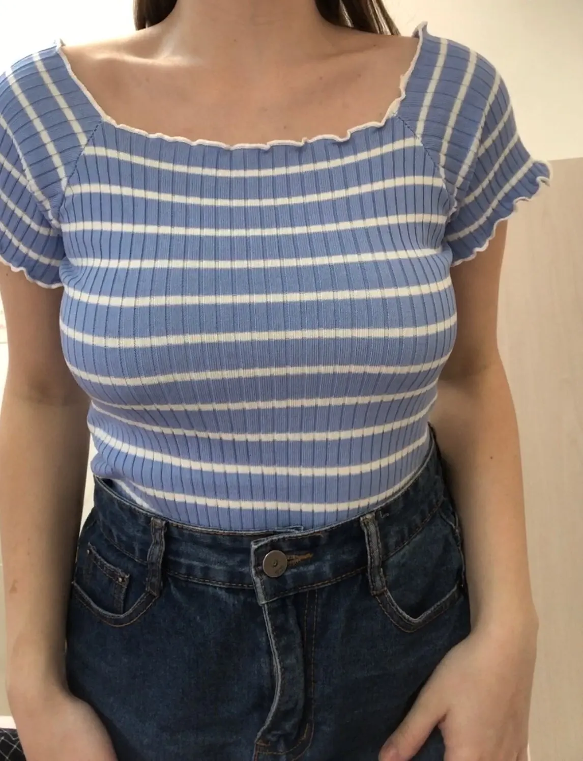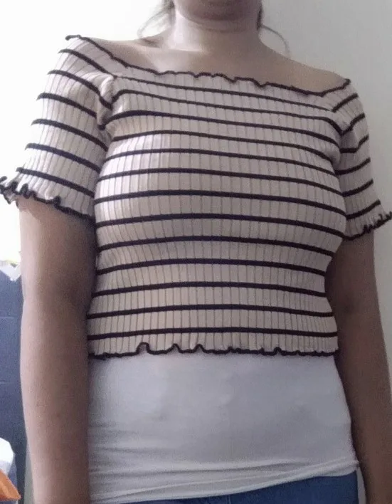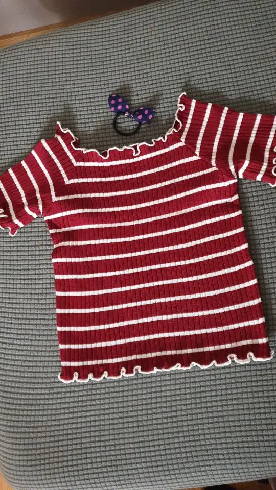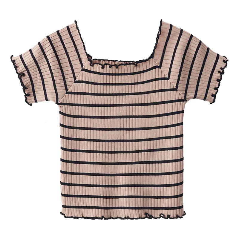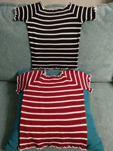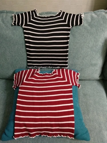 Футболка женская трикотажная в полоску, с открытыми плечами и воланом на подоле, с коротким рукавом, лето 2021