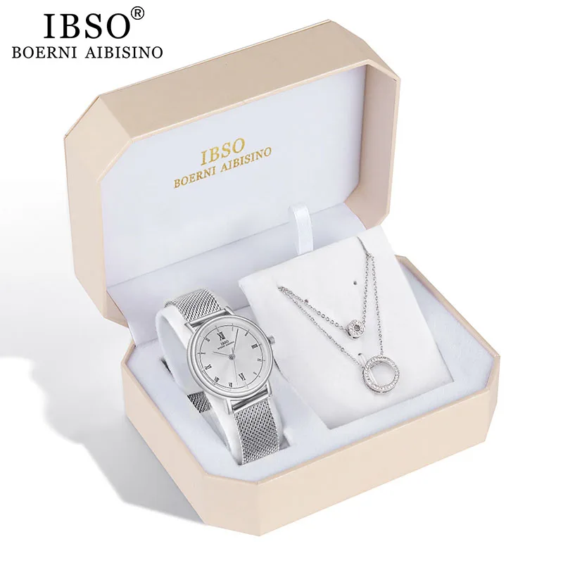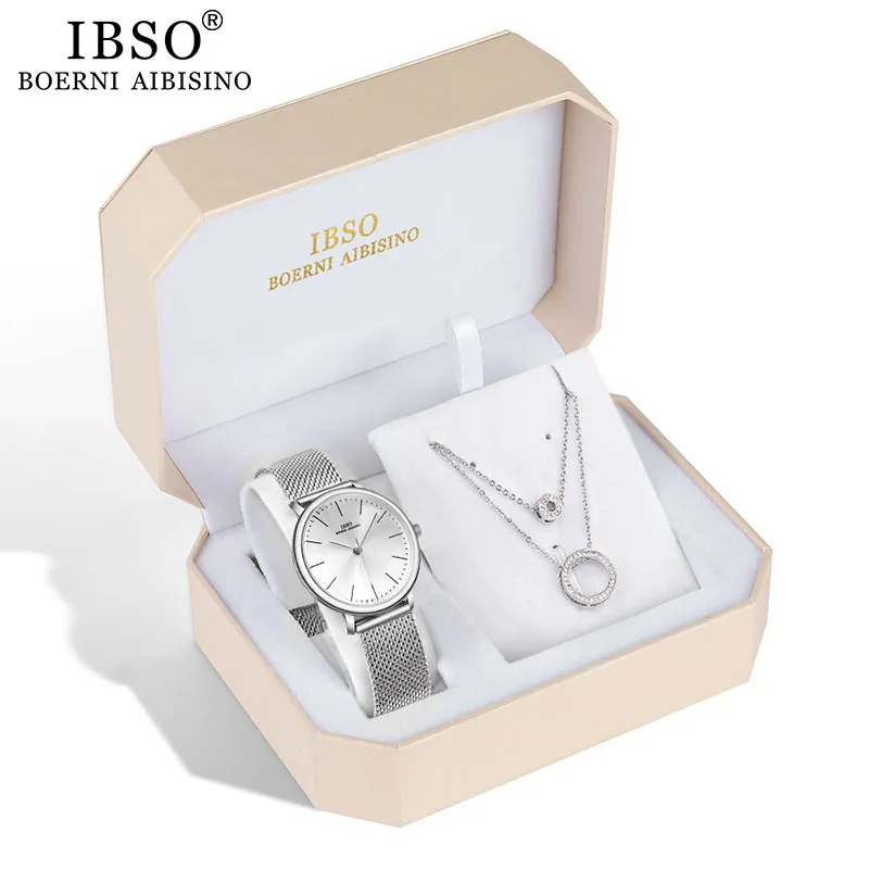 Женский комплект часов IBSO, серебряное ожерелье и кварцевые часы, ювелирный набор, модные креативные кварцевые часы с кристаллами, Дамский подарок