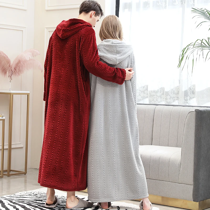 Женский зимний длинный теплый фланелевый Халат, уютный размера плюс ночной халат на молнии для невесты, Мужская одежда для сна, банный халат с капюшоном