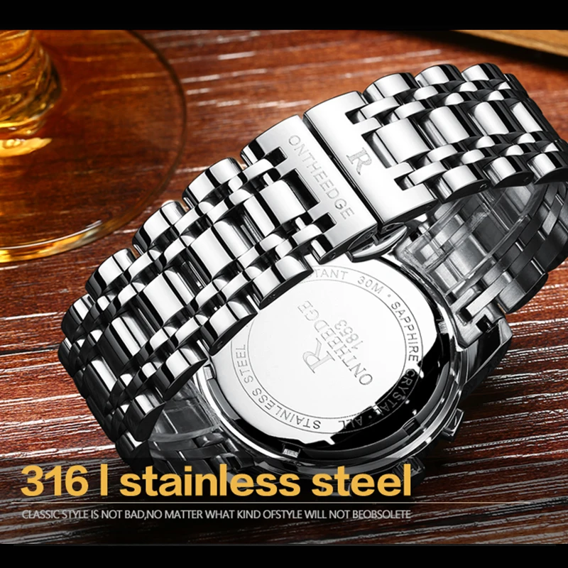 Часы наручные ONTHEEDGE Мужские кварцевые, роскошные брендовые водонепроницаемые деловые с хронографом, полностью стальной функцией, с календарем