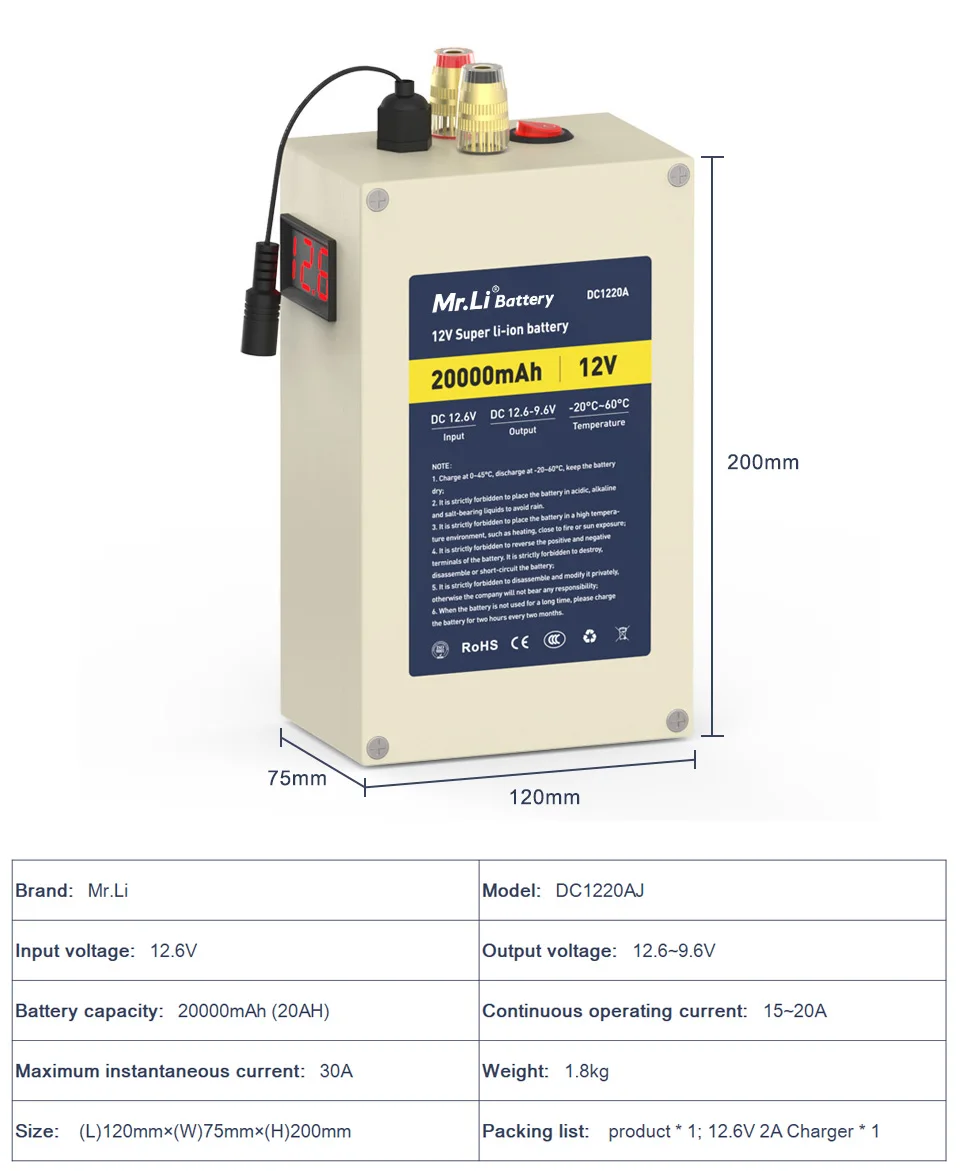 Батарея Модель: 12V 20AJ Тип батареи: литий-ионный аккумулятор 18650 Номинальное напряжение: 12 В Номинальная мощность: 20Ah Комбинация: 3S8P Мгновенный ток разряда: 40A Ток непрерывного разряда: 20A Напряжение зарядки: 12,6 V Время цикла: более 1000 циклов Температура зарядки: 0 ~ 45 ℃ Температура разряда: -20 ~ 60 ℃ Температура хранения: -20 ~ 45 ℃ Вес: около 1,6 кг Размер батареи: 200*120*75 мм Диапазон рабочего напряжения: 9,6 V-12,6 V Защита от избыточного заряда благодаря напряжение: 12,6 V + 0,05 V Предохранение от перенапряжения: 9,6 V + 0,05 V