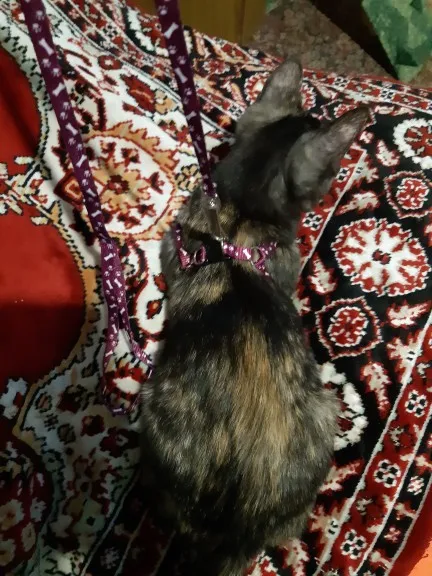 заказ пришёл очень быстро, даже не ожидала, моей киське 4 месяца, шлейка подошла, еще и на вырост осталось)) крепления металлические, что порадовало, размер можно регулировать, поводок отслеживается и его длина 110 см.