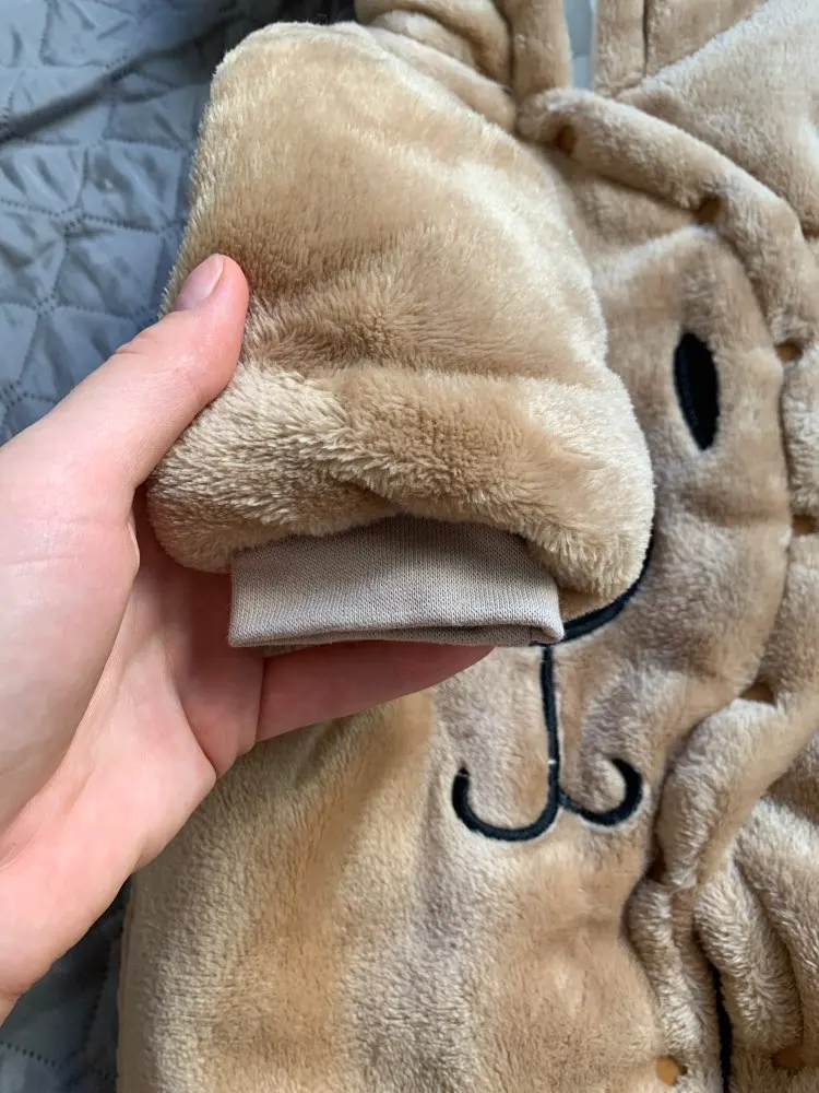 комбинезон мягкий и теплый. сверху плюш, а внутри хлопок. все кнопки хорошо застёгиваются. Продавца рекомендую.