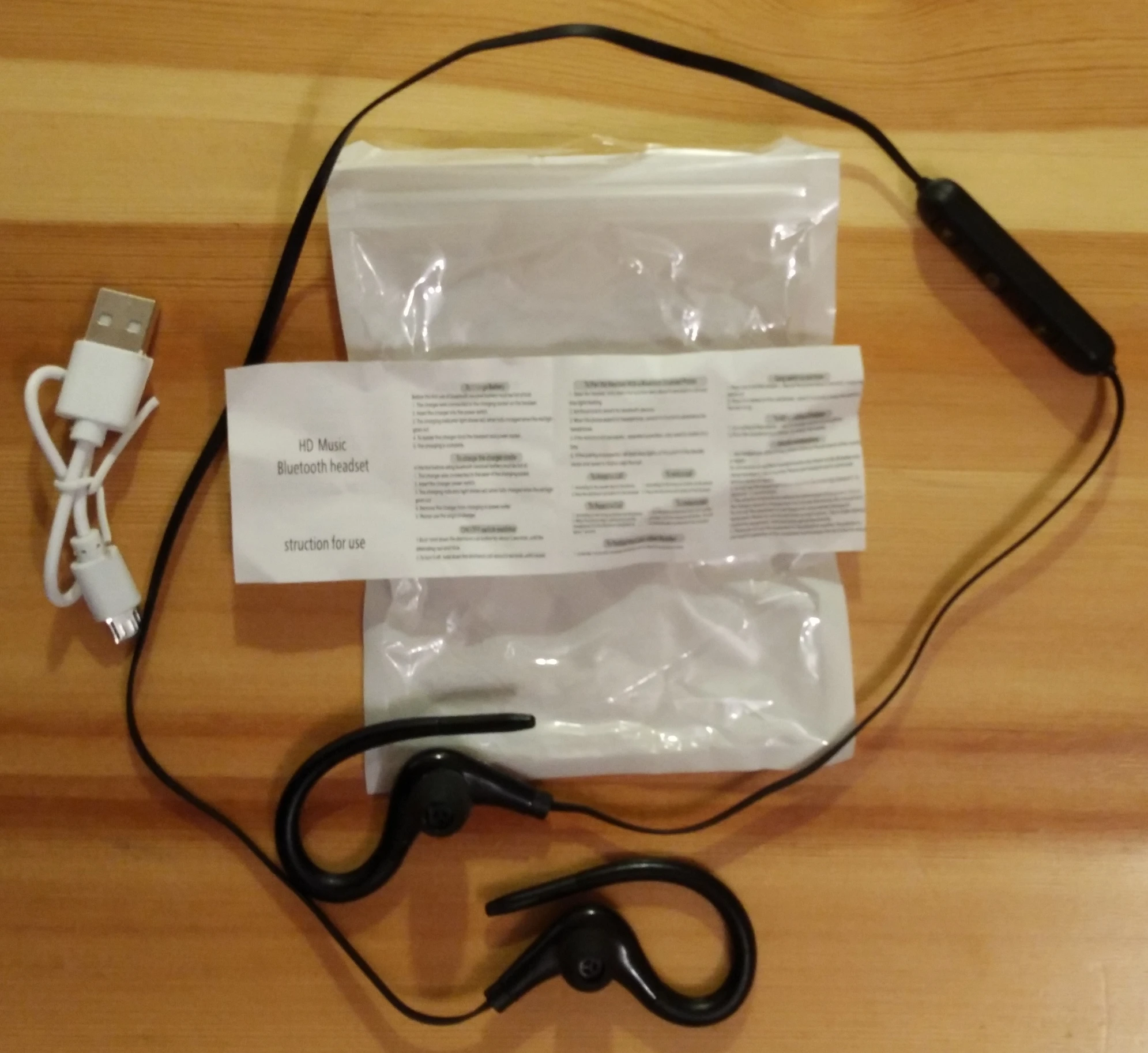 Заказ был отправлен быстро, но добирался 2,5 месяца. Помимо наушников в комплекте руководство на английском, напечатанное ОЧЕНЬ мелким шрифтом и короткий шнурок для зарядки. Сами наушник хлипкие, легко раскладываются на половинки, но так же легко собираются обратно. Звук есть и микрофон работает. Плохо обработанный пластик царапает уши, когда пытаешься задвинуть поглубже. Не засунешь - не будет басов. Они всё равно выскакивают, но не спадают благодаря креплению за ухом. Из-за этого и брал. Я не разочарован, даже доволен, потому что брал одни из самых недорогих и представлял, что получу. Главное, что не выпадают при ходьбе или беге.