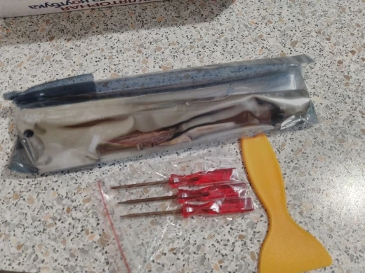 Хорошо упакован, в комплекте отвертки и скребок. Работает из коробки. Доставка только долгая.