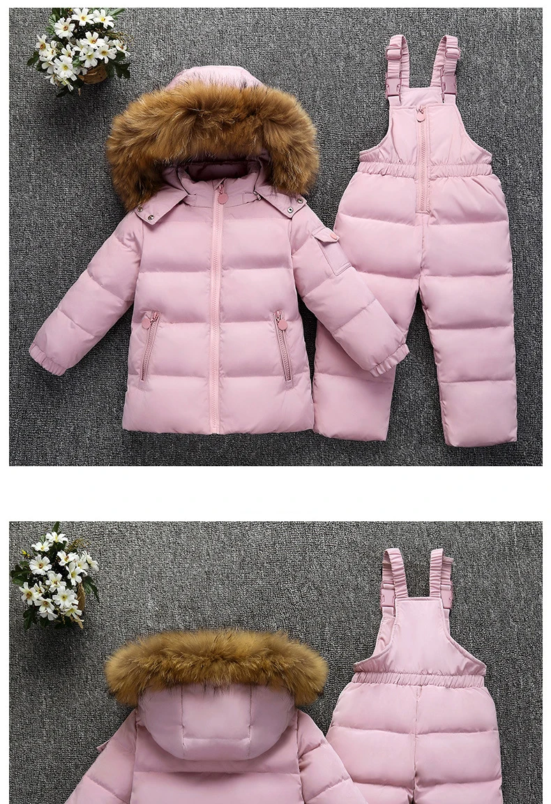 Новинка, зимние теплые лыжные костюмы для маленьких мальчиков, комбинезоны с искусственным мехом, пуховики для девочек, верхняя одежда, пальто + подтяжки для прыжков