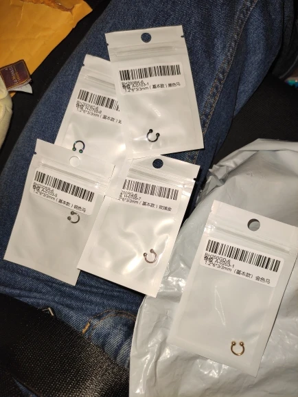 Пришли все пять штук, дошли очень быстро, не прошло даже и две недели. Качество хорошее, закручиваются и откручиваются концы тоже хорошо, внезапно теряться при носке точно не будут (как серьги собираюсь их носить). Сравнила с моими другими септумами (покупала не у этого продавца) - у новых концы меньше. Это не критично, но я не ожидала, что будет такое отличие. Немного рассмешило, что все эти колечки были в разных пакетиках, которые очевидно им очень велики. С продавцом не общалась. В общем, советую этот товар!