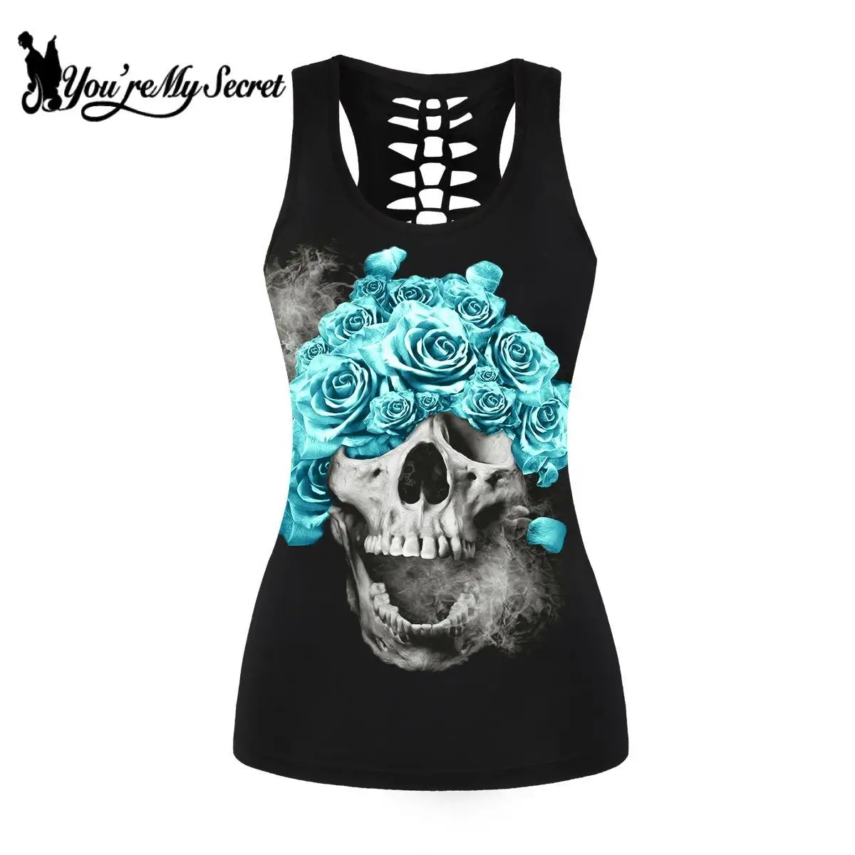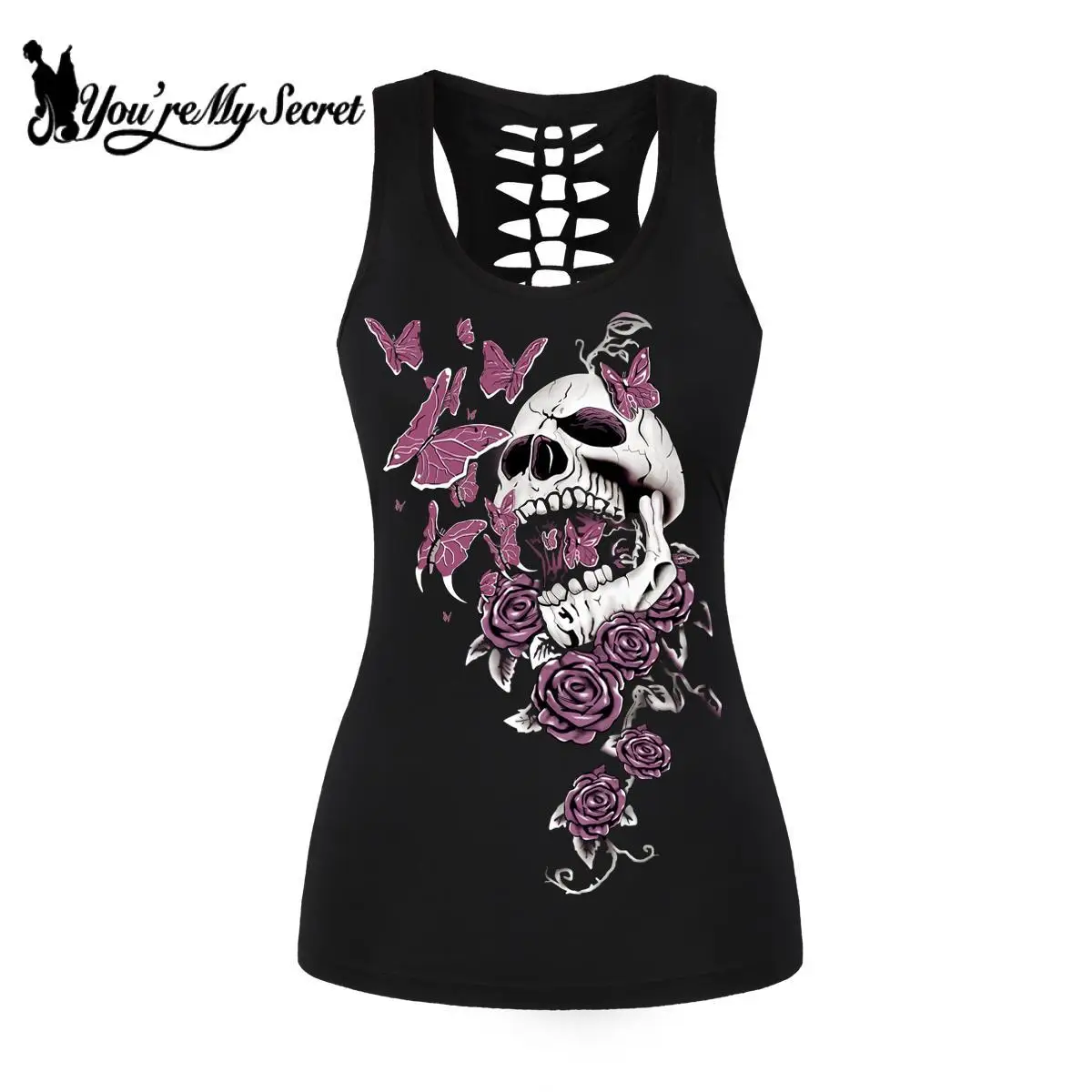 Женский летний открытый Топ You Are My Secret, готический жилет с открытой спиной, летний облегающий черный топ с черепом и розой для Хэллоуина и фестиваля