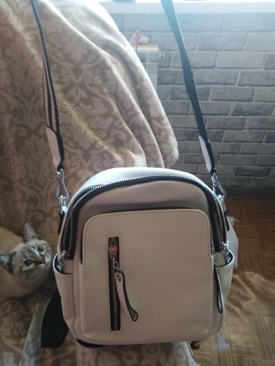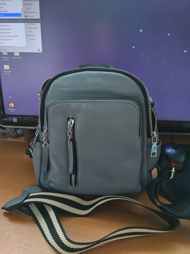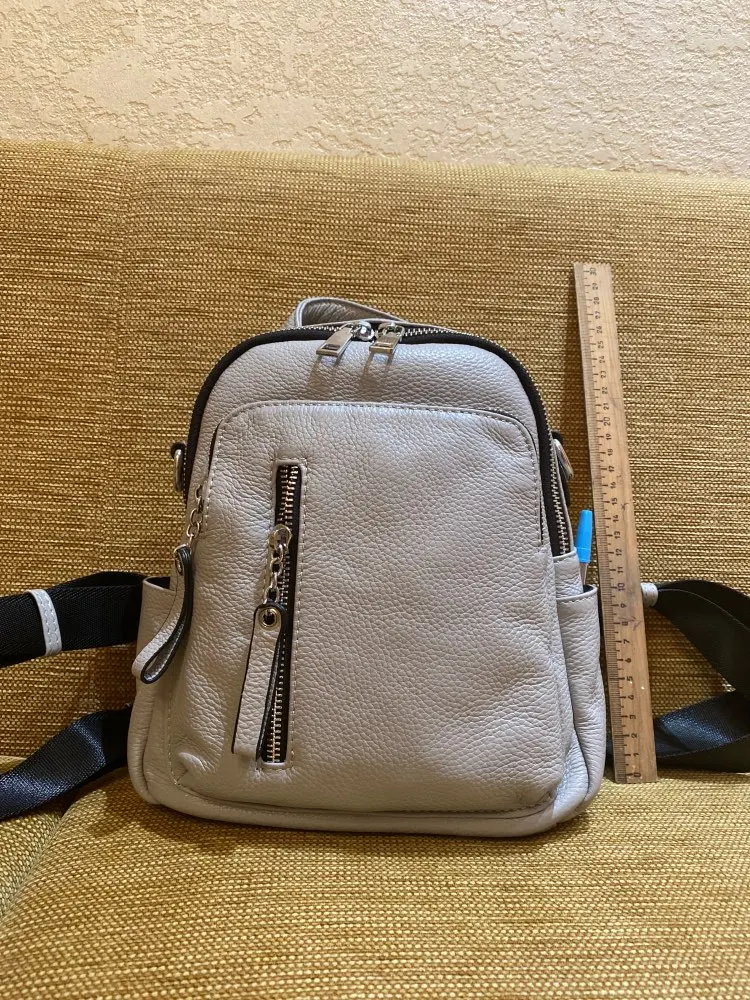 Обалденный! Полностью соответствует описанию и размерам. На третьем фото рюкзак рядом с папкой А4. Компактный, но очень вместительный. Косметичка, расчёска, документы, маски, санитайзер, ключница влезают без проблем, много отделений и кармашков. Тёплый светло-серый цвет, натуральная плотная кожа. Единственный момент - у меня металлические регуляторы длины лямок оказывались аккурат на плечах, очень неудобно. Поэтому я их срезала и сшила лямки на постоянную и удобную мне длину.