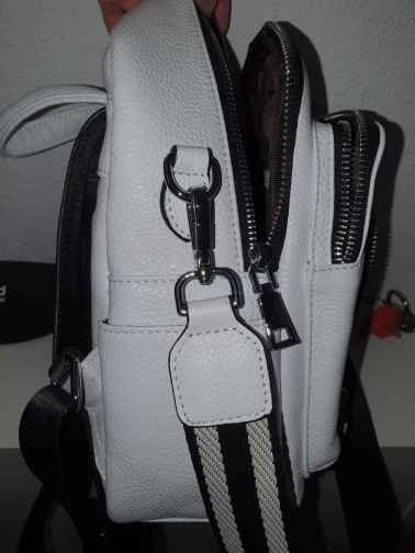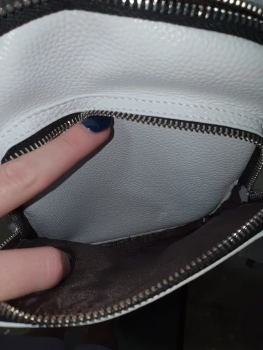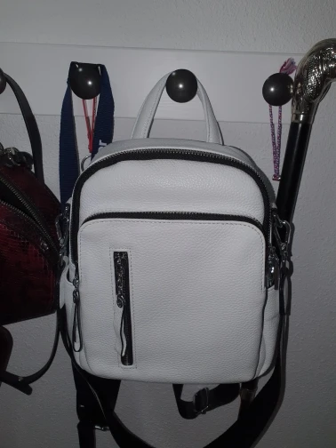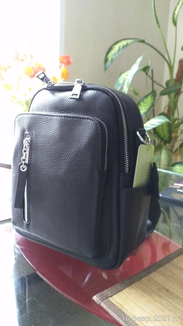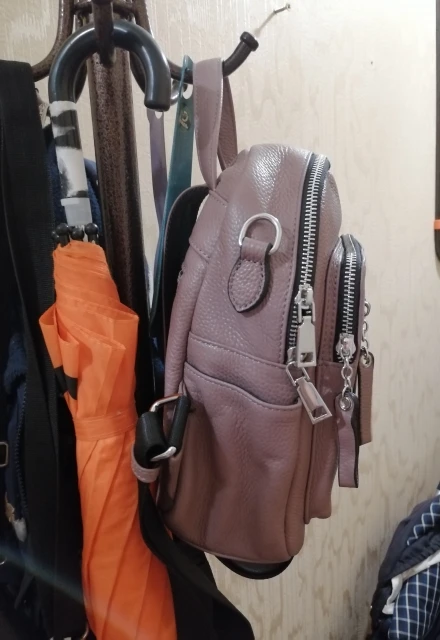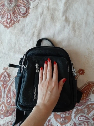 Рюкзак дошёл очень быстро, меньше двух недель до Московской области. Очень симпатичный, размер именно тот, что ожидала. Два отделения, два наружных и два внутренних кармана на молниях, три кармашка без молний в большом отделении и два по бокам. Всё прошито очень аккуратно, подкладка качественная, не шелестит и не скользит. Снаружи всё срезы закрыты, но в маленьком отделении оставлен необработанный - это кожа. Поверхность (структура, рисунок, цвет) полностью совпадает с материалом рюкзака). Зонт, который на фото для сравнения - 30 см, естественно, не помещается полностью, ручка торчит. Если нужен небольшой женский рюкзак - замена дамской сумки, не хозяйственной - рекомендую.