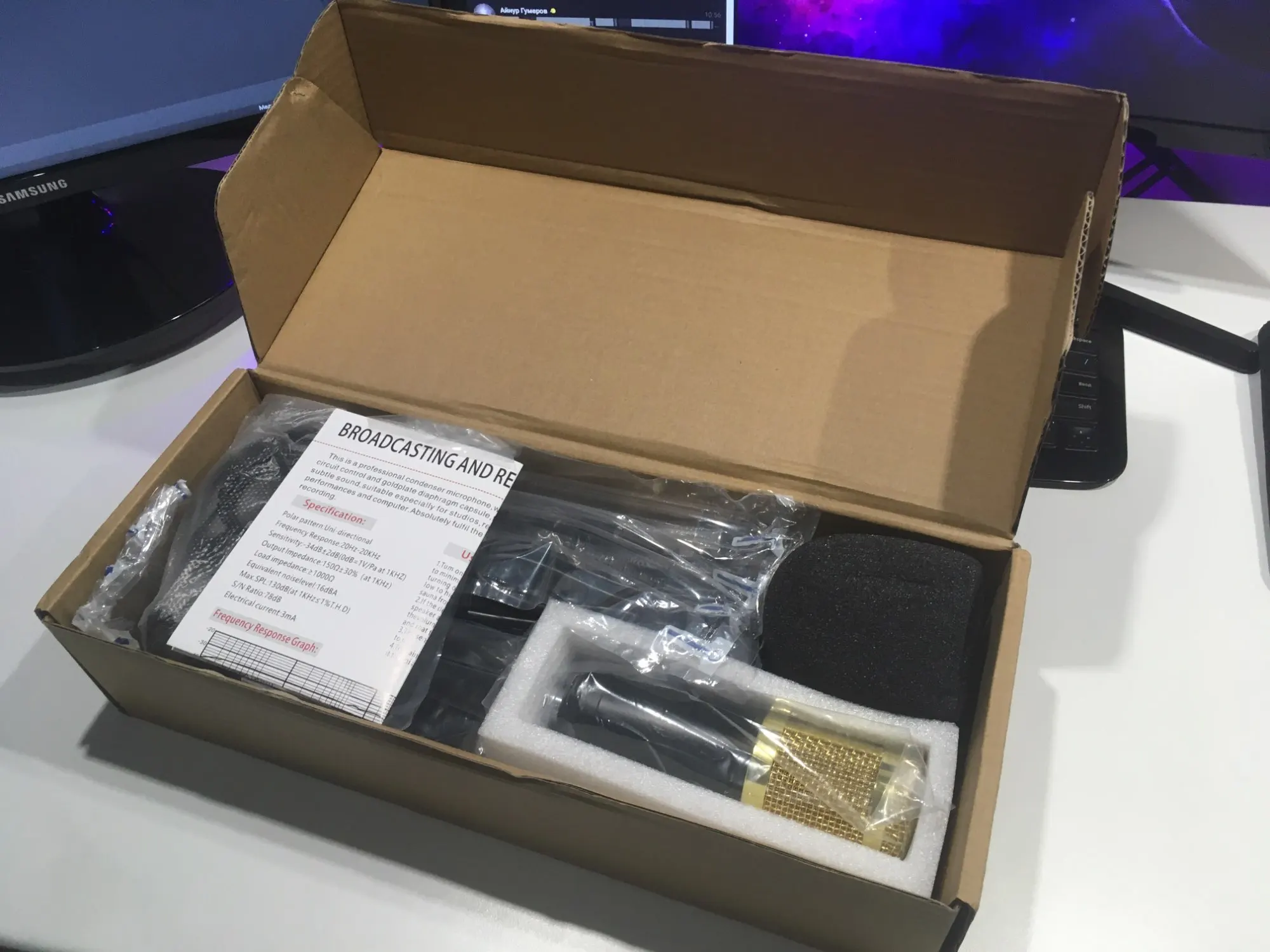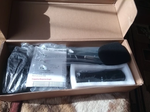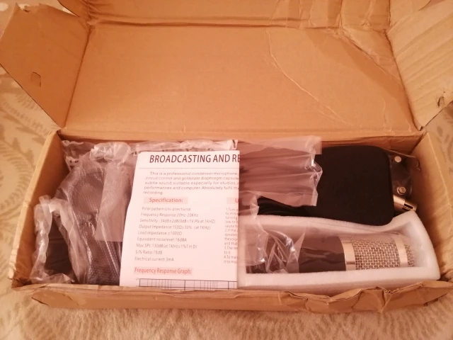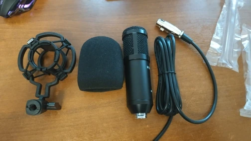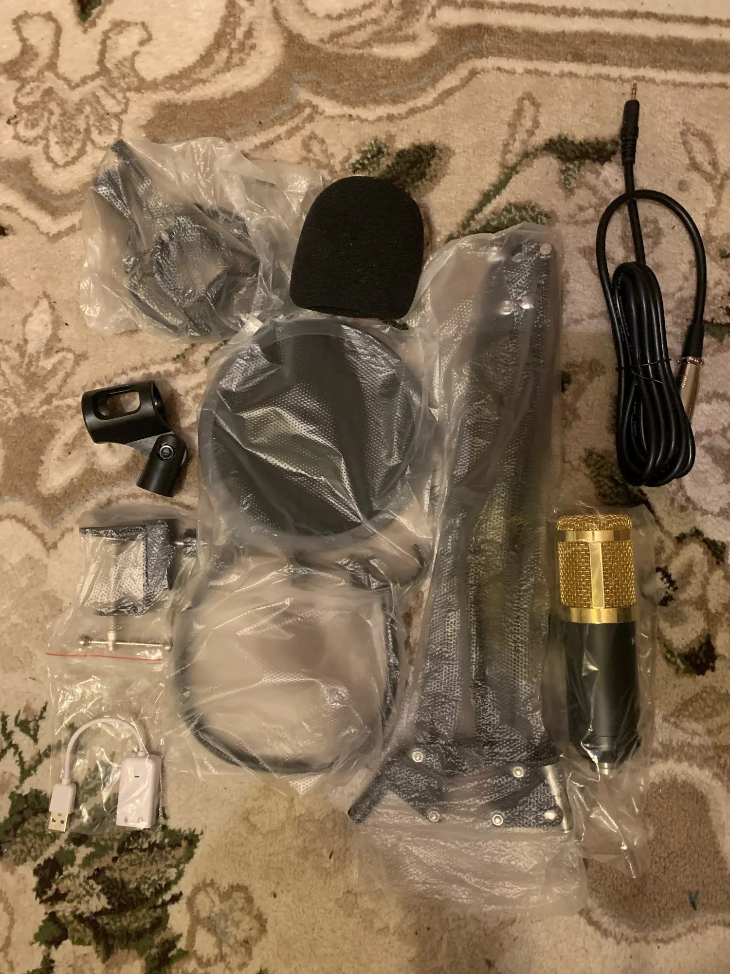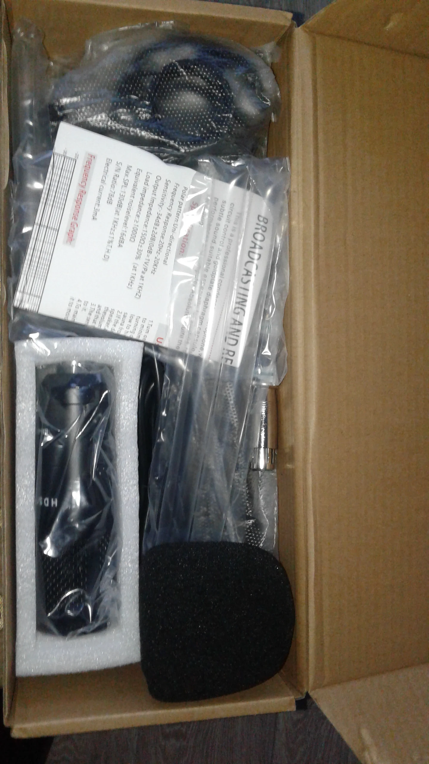 Все, как в описании. Микрофон и все его части в фирменной коробке, в нее же подложена копеечная USB-звуковуха. Проверил микрофон в Audacity, работает, голос ловит посторонних шумов нет За свои деньги нормальный вариант