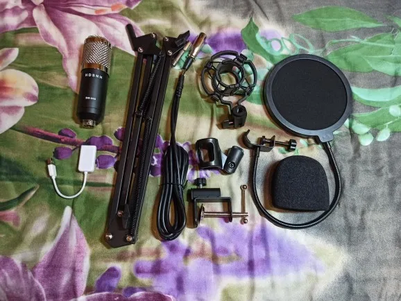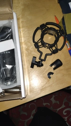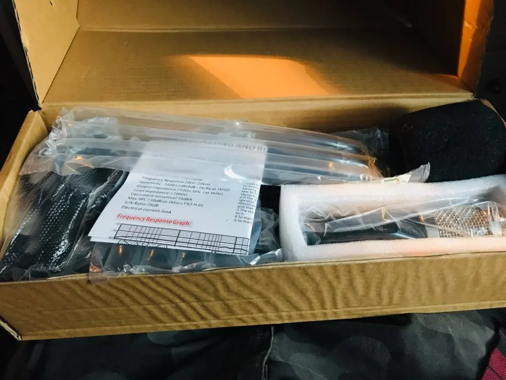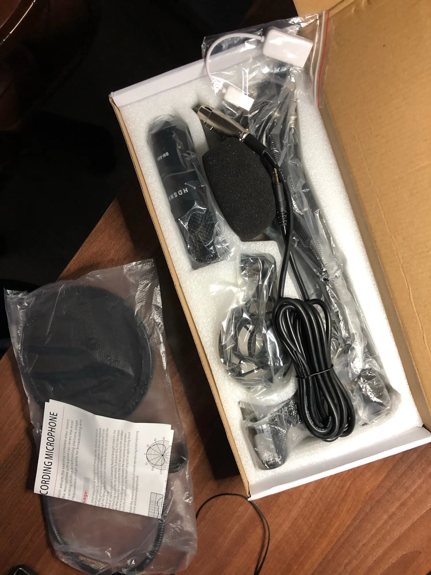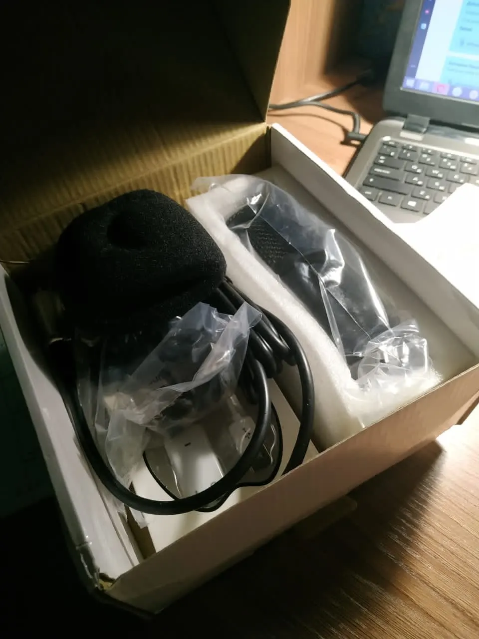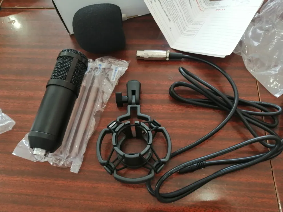Все, как в описании. Микрофон и все его части в фирменной коробке, в нее же подложена копеечная USB-звуковуха. Проверил микрофон в Audacity, работает, голос ловит посторонних шумов нет За свои деньги нормальный вариант