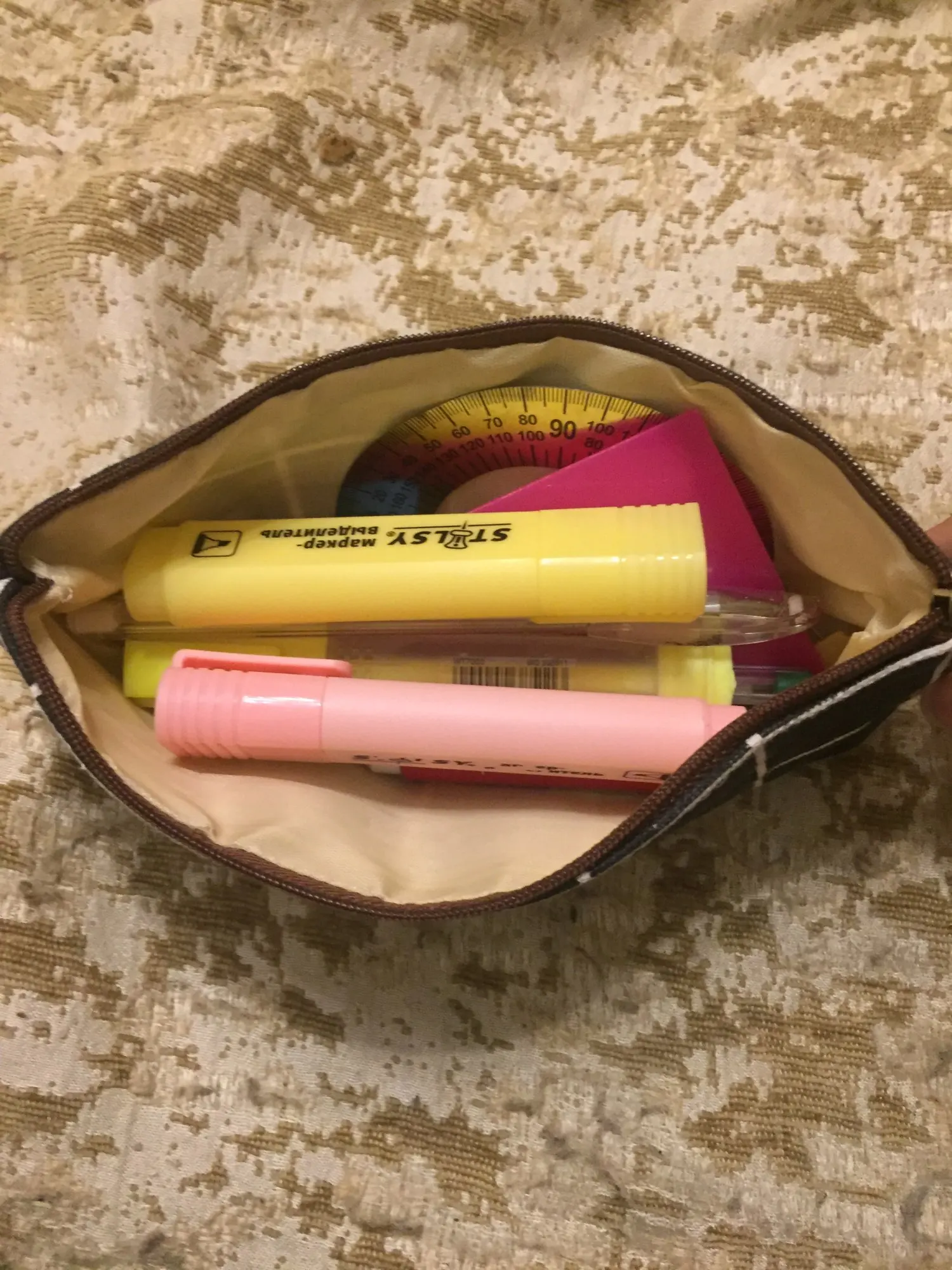 Все хорошо, НО, на свету немного просвечивается ткань тонкая но в этот пенал поместилось замазка и 4 текстовыделителя большихтак что довольно вместительный!! отличный пенал