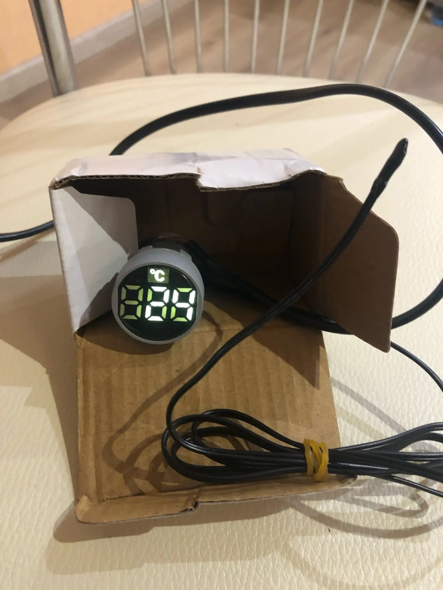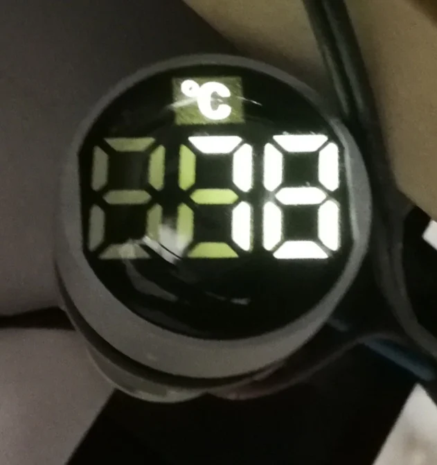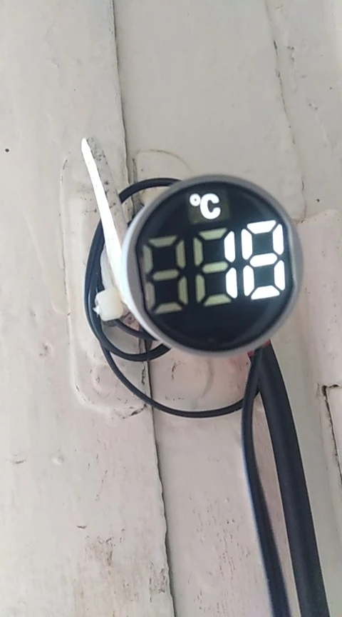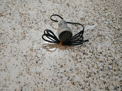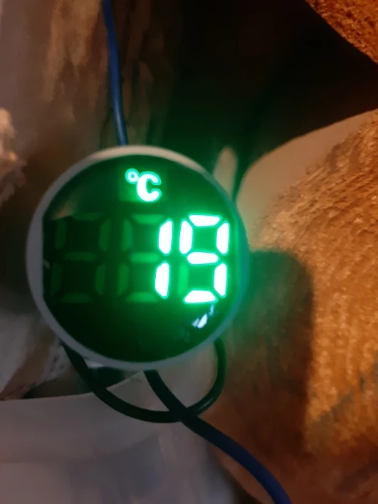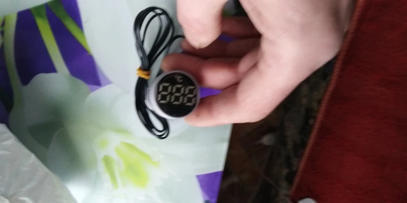 Подключается легко, два провода фаза и ноль, провод для измерения короткий, измеряет быстро, довольно чётко, погрешность устраивает. Читаются показания при свете не чётко. На фото два измерения, морозильник - 19, стакан горячей воды +78.