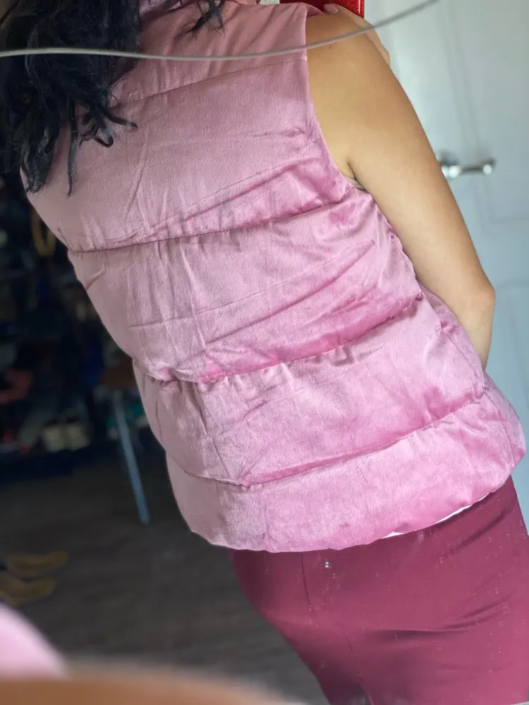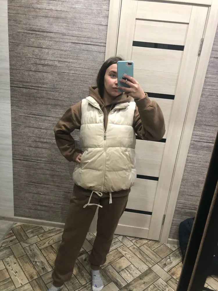 Ахеренная жилетка ! Заказала М почитав отзывы,но можно было и С ,была бы по фигуре ! Но и М хорошо ,к низу много дутая получается )) спасибо за подарочек ,внутри положили резинка для волос