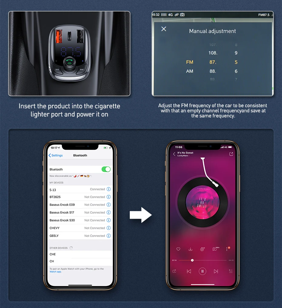 Очень очень хороший продукт! Больше, чем на фотографиях! :-) Хорошо сидит в разъеме. Очень быстрое соединение с телефоном и автомобилем. Хорошее качество потокового аудио. Работает с spotify и другими! Я рекомендую его всем.