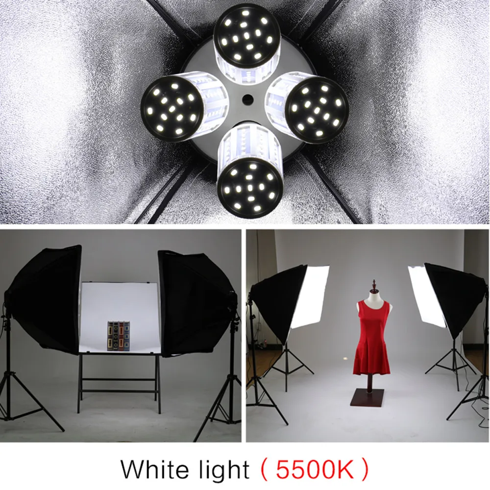 Это идеальный набор софтбоксов для цифрового фото-и видеосъемки.Четыре держателя лампы: сочетаются с 4 лампами, Цоколь E27 подходит для большинства осветительных приборов.Четыре вида адаптера питания: штепсельная вилка европейского стандарта, штепсельная вилка американского стандарта, штепсельная вилка британского стандарта, штепсельная вилка австралийского стандарта.50x70 софтбокс: белая Складная мягкая ткань, Высококачественная Светоотражающая частица. Безопасное и нетоксичное полиэфирное волокно, 4 гибких соединительных стержня.Светильник: высота в сложенном виде 27 дюймов (68 см), рабочая высота 79 дюймов (200 см). Высокое качество, стабильный и прочный, прост в установке и использованииОксфордская сумка: может содержать все детали продукта, легко носить с собой. (Только покупайте лампы, отправляйте оксфордскую сумку)20 Вт кукурузный светодиодный светильник: 2 вида светильник s (белый и желтый), алюминиевый + пластиковый светильник, прочный и долговечный, низкая рабочая температура, деликатный и светильник.Дайте 2 дополнительных предохранителя для подарка (чтобы предотвратить сжигание предохранителя из-за чрезмерного рабочего времени)
