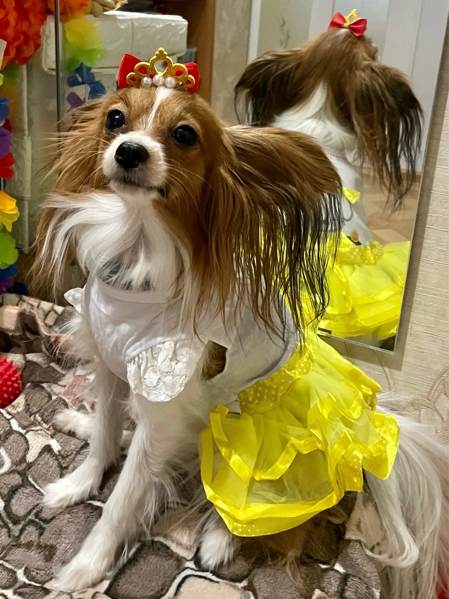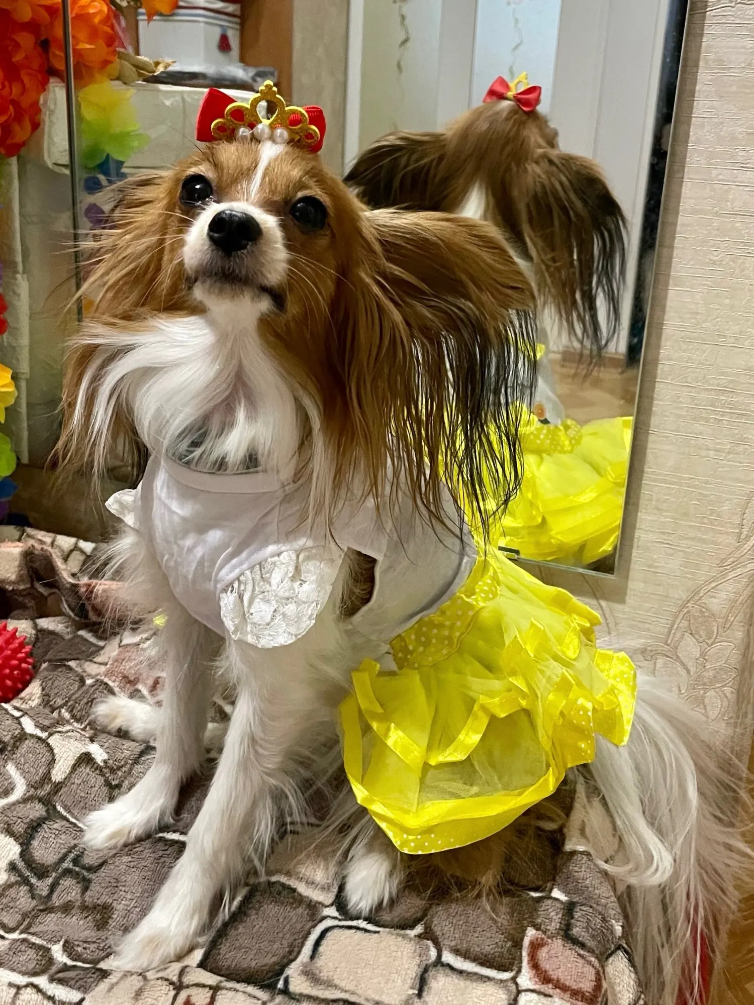 На папийона 3 кг платье подошло отлично. Корона без крепления. На фото собачка просто её держит по команде на голове. Что-нибудь приклею к короне. Прибыло в постомат в Пятёрочку, даже на пару дней раньше указанного срока. Платье рекомендую! Спасибо!!!