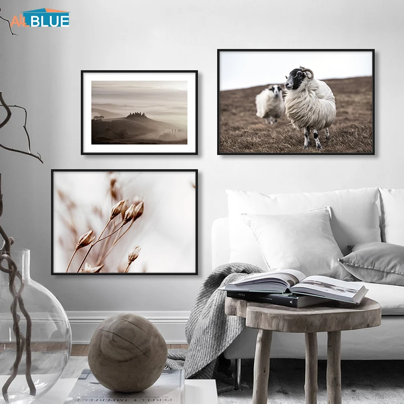 Долина пейзаж холст плакат в скандинавском стиле постеры с животными и принт растение рисунок с овцами стены искусства картина для декора гостиной