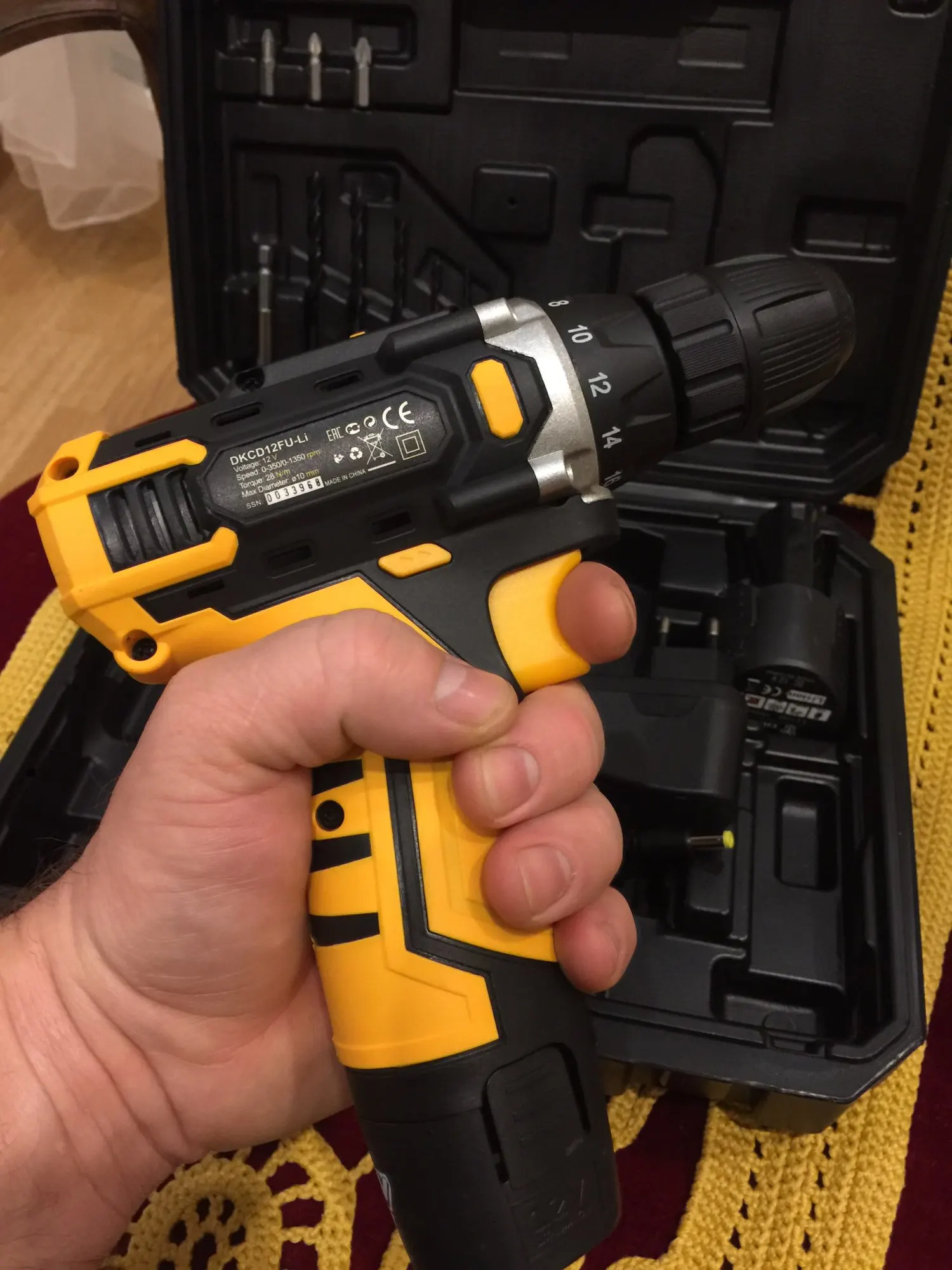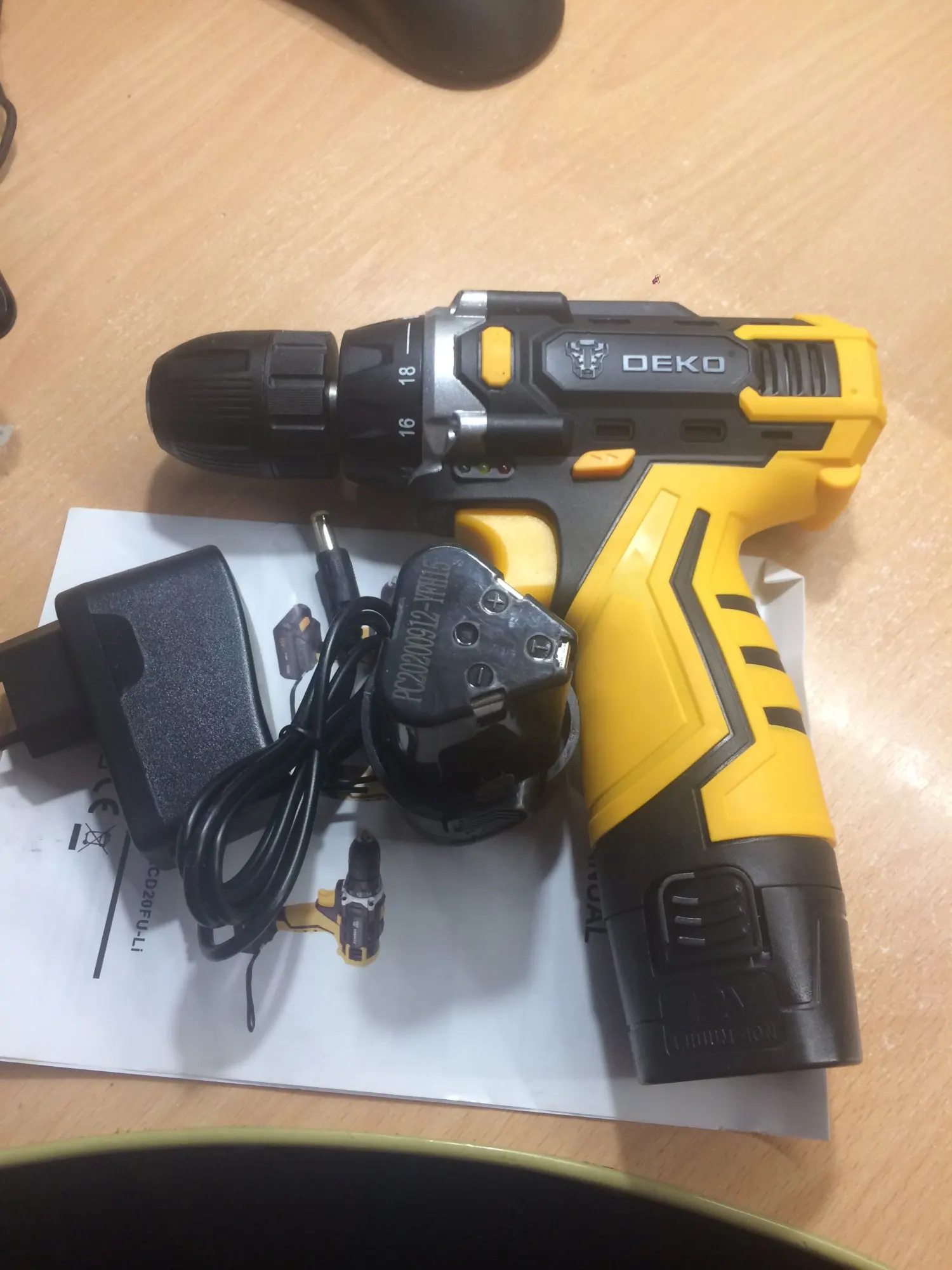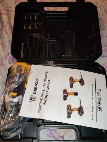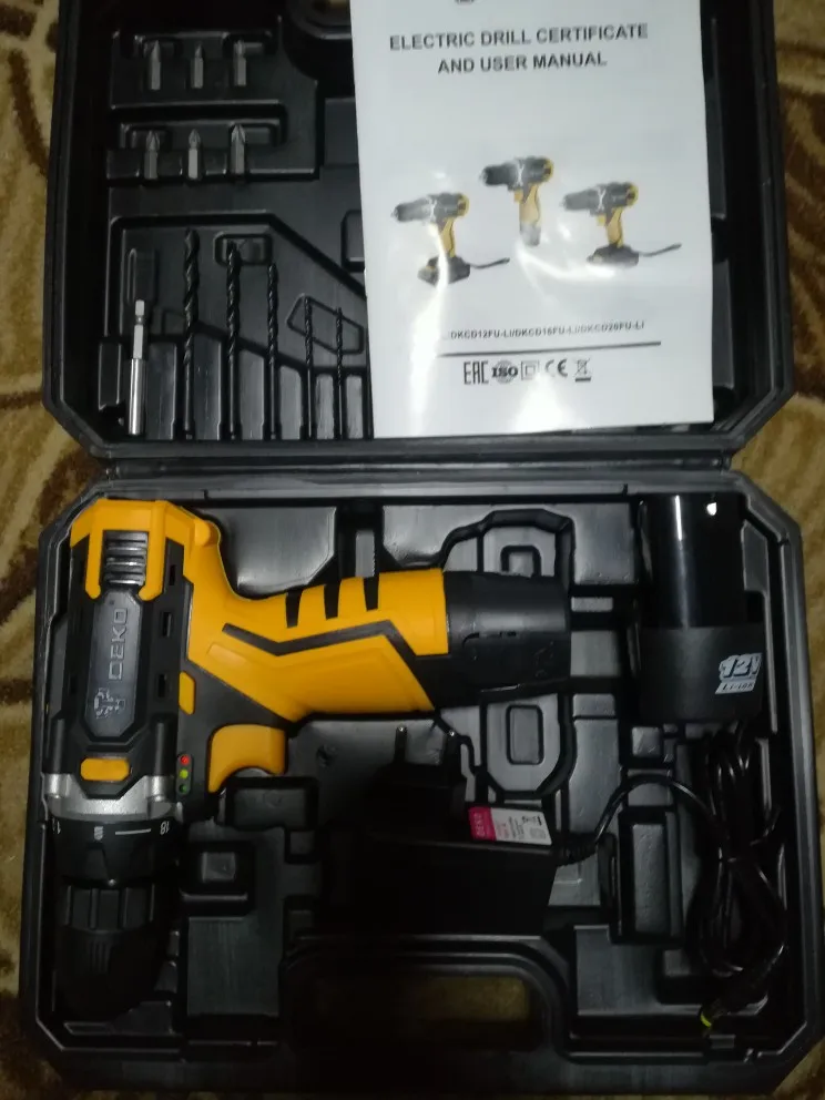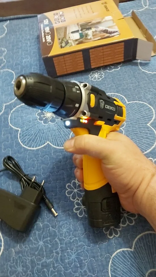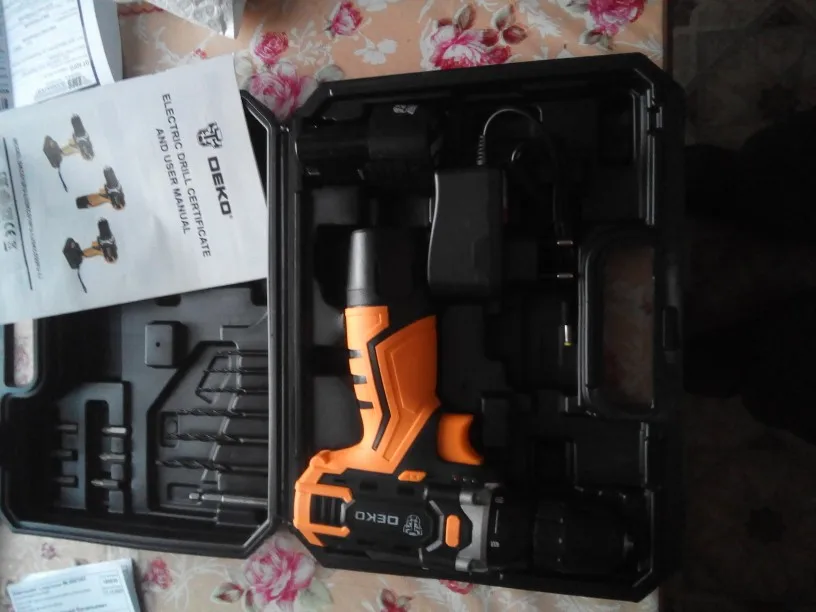Супер быстрая Доставка за 3 дня! Очень хороший дрель по цене. Аккумулятор немного трудно удалить: Вы должны нажать очень сильно с каждой стороны, чтобы разблокировать его. Инструкции на английском языке. Отсутствие объяснений для обслуживания аккумулятора (зарядка полностью? Отключить зарядное устройство, когда зарядка завершена? Остановка автоматической зарядки?
