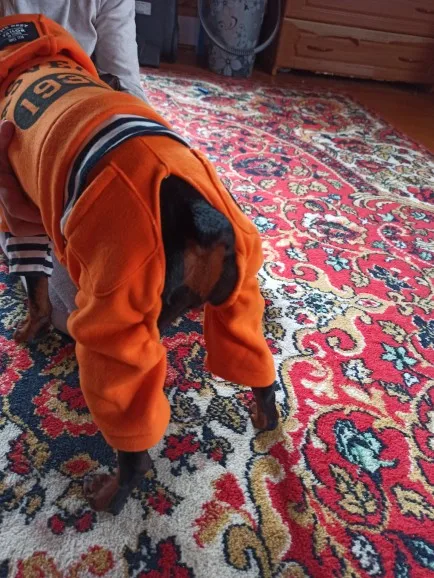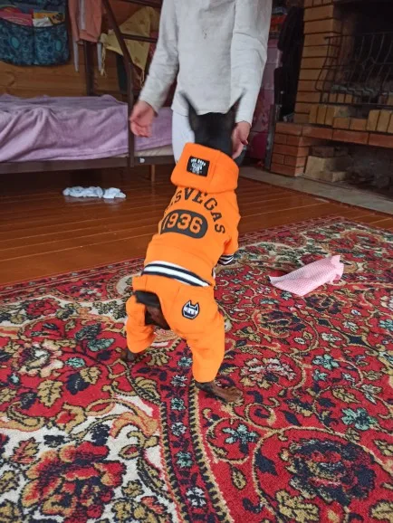заказала 7.07,забрала в пятерке 16.07,покупала за 716р,товаром довольна,плотный комбез,внутри мягкий флис,у размера М длина рукава 11'5 см на передней лапе,длина спинки комбеза от шва капюшона до конца 30 см,на цвергпинчера 4 месяца,высота в холке 25см,длина спины до основания хвоста 28см,обхват шеи 22см,сел хорошо,но пока хвост прикрывает,брали на вырост