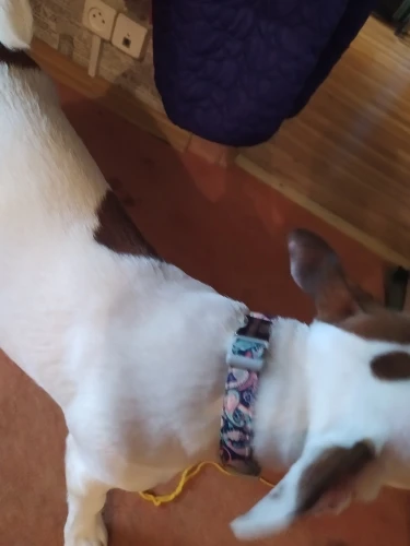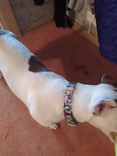 Шикарный ошейник. На Французского бульдога, размер М с небольшим запасом. Быстрая доставка. На пряжке имя и тел. Продавцу спасибо.
