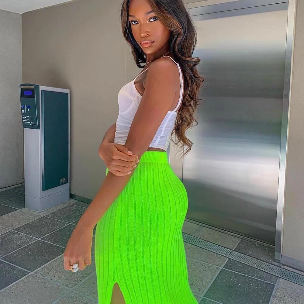 Юбка BKLD Женская трикотажная неоново-зеленая, с разрезом по бокам, с эластичной завышенной талией, в рубчик, ярко-розовая, Длинная тонкая юбка