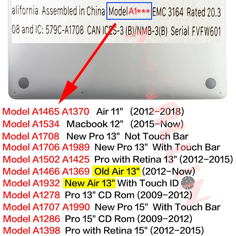 Примечание: Если вы не уверены в размере, пожалуйста, проверьте заднюю часть вашего макбука, вы можете увидеть напечатанную там модель (Axxxx), И тогда вы можете выбрать подходящую обложку для вашего mcbook со следующей таблицей сравнения, или свяжитесь с нами, мы хотели бы помочь.
