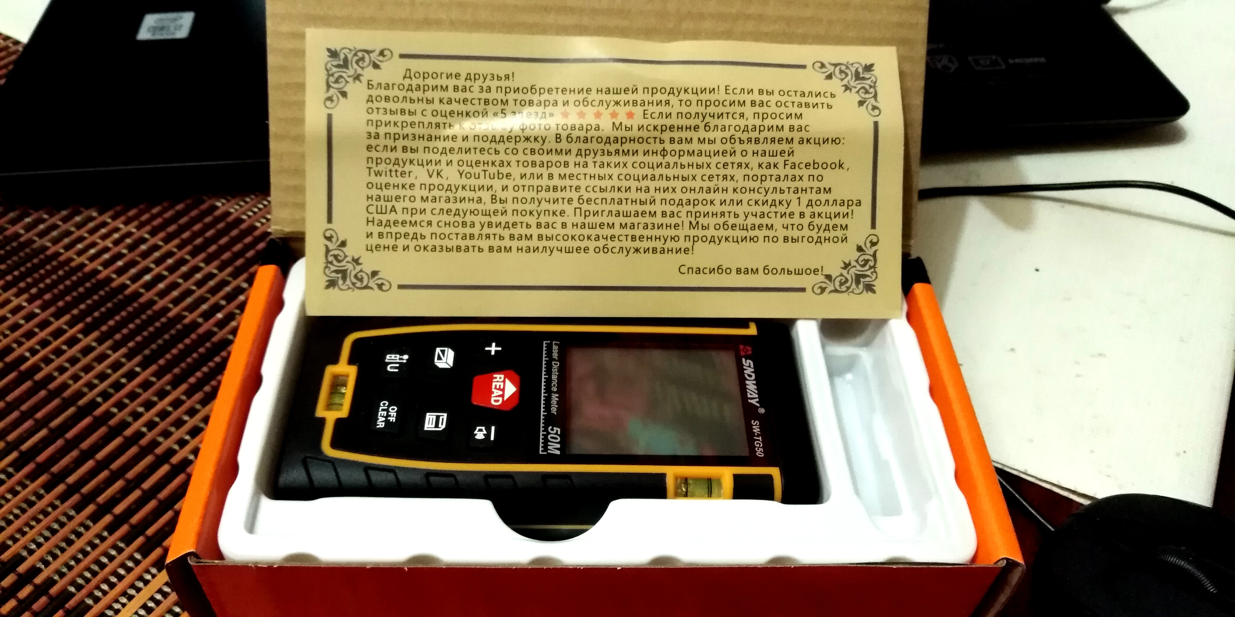 продавец отзывчивый, товар пришёл неожиданно быстро, пока всё работает погрешность как описано на белом цвете. в комплекте карточка с нанесением ксералика. на других цветах погрешность. но есть калибровка. вообщем относительно других рулеток остался доволен.