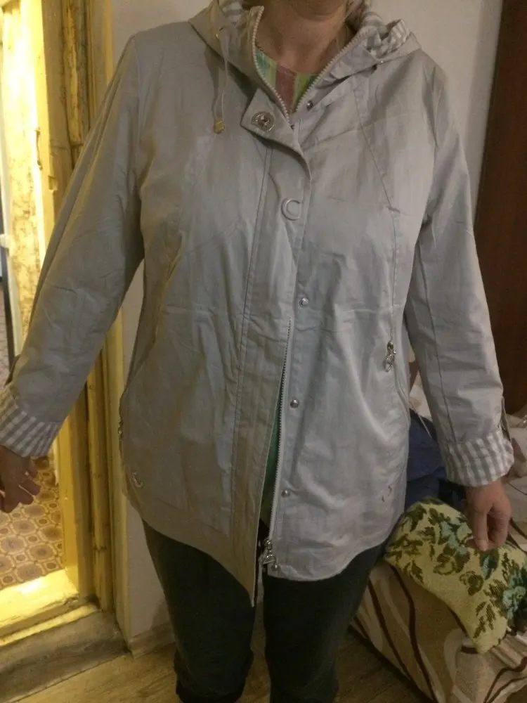 Великолепная куртка. Так называемый плащ. Всё идеально. Пошив, модель, фурнитура, подкладка выше всех похвал. Лёгкая , удобная. По длине точно такая как сидит на модели. Подходит на прохладную погоду. Большое спасибо продавцу.