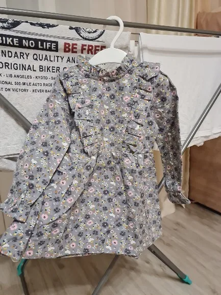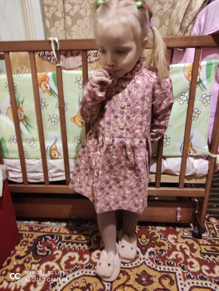 Когда увидела это милое платье, не смогла отказаться от него и заказала дочке. Хоть и был ноябрь, заказала с запасом, чтобы носить весной. В других отзывах правильно пишут, оно маломерит. На рост 98, заказала размер 110, немного с запасам. Платье просто супер, всё как на картинке, тёплое, милое, мягкое. Все швы ровные, запаха нет. А если учесть что оно досталось мне за 220 рублей, то это вобще супер. Дошло кстати очень быстро, меньше месяца.