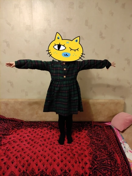 Платье очень качественное и красивое. Ткань - настоящая фланель. Только вот примерить сейчас не могу. Заказала 4Т, а на этикетке написано 120 ... Посмотрим. Позже попробую не забыть дополнить отзыв.