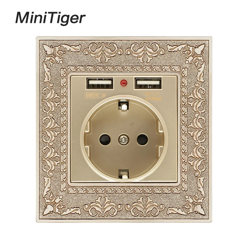 Minitiger Высококачественная ретро-панель из цинкового сплава 16А золотой стандарт ЕС настенная розетка с двойным USB 2.1A зарядным портом рельефная панель