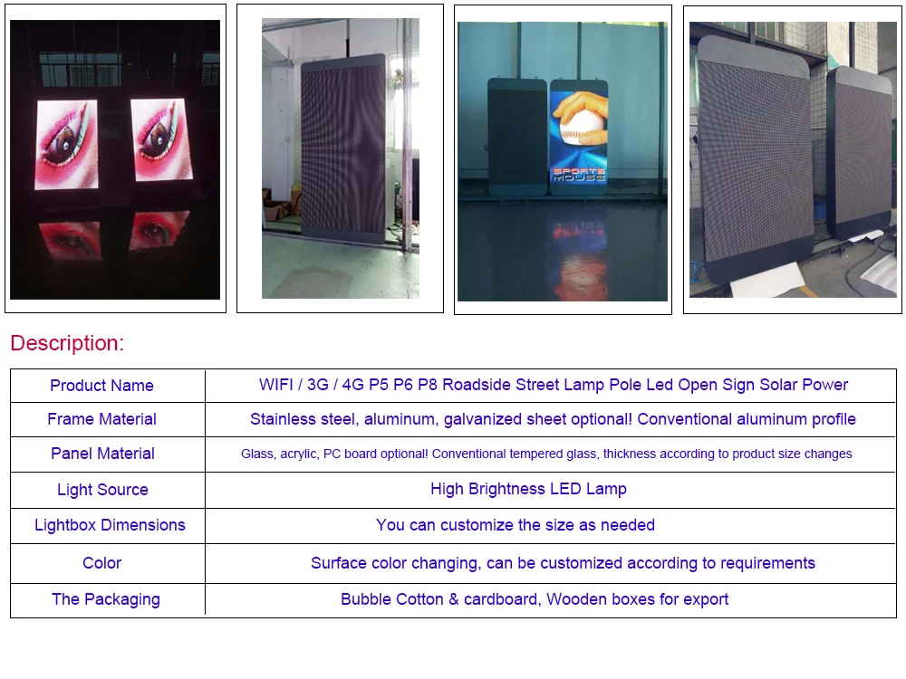 Если вам нужен осветительный экран, пожалуйста, свяжитесь с нами Особенности: 1. Хороший внешний вид и дизайн 2. Простота в обслуживании 3. Яркие изображения и видеоэффекты 4. Форма мобильного телефона 5. Размер может быть изменен 6. Управление 3G 4G или WIFI 7. Материал шкафа: алюминий Область применения: Дорожная сторона, уличный свет Полюс, автобусная станция