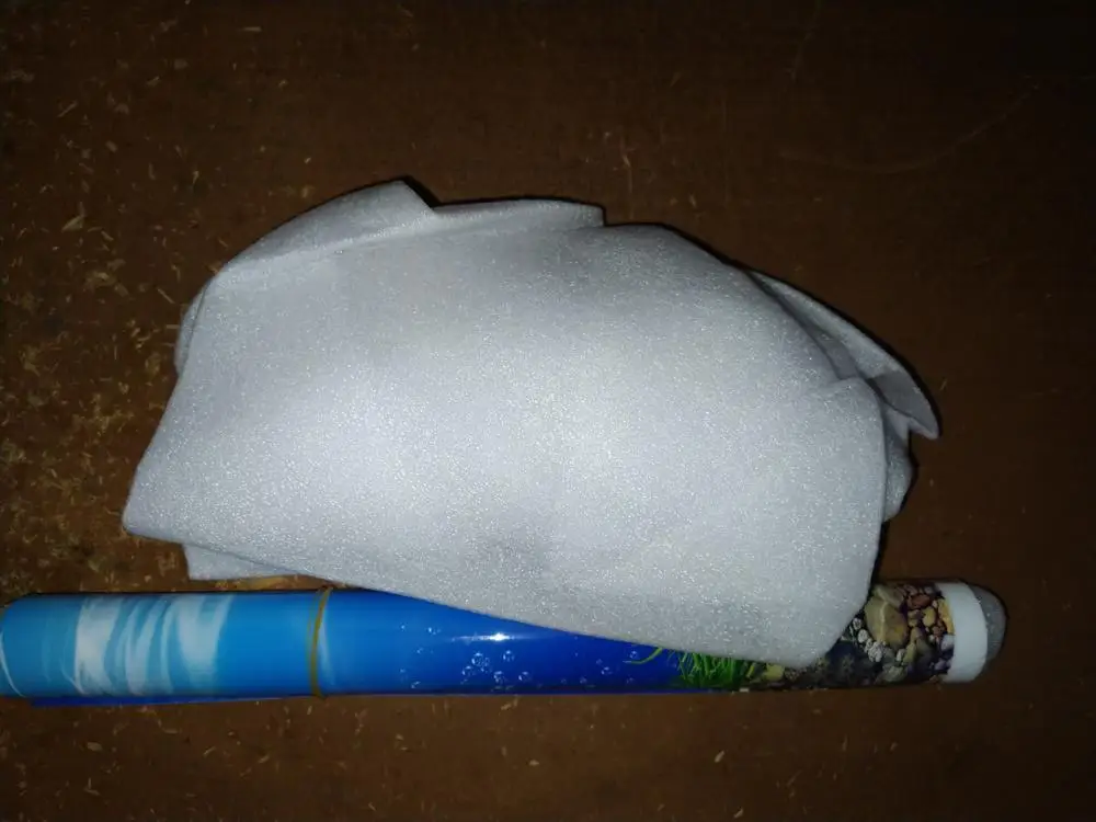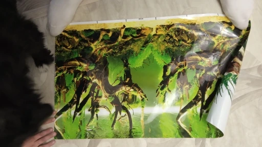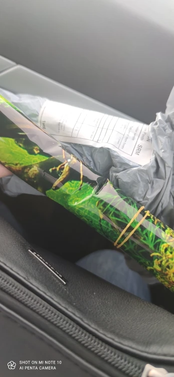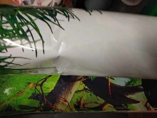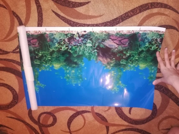 Очень классный двухсторонний фон. Продавец еще положил 4 прозрачные наклейки прямоугольники, которыми удобно прихватить фон к аквариуму. Ехал около месяца, намотан та мягкую тубу, заломов нет, запахов нет однозначно, товар рекомендую. Не сфоткала полный лист, фоткаю уже обрезок того, что осталось.