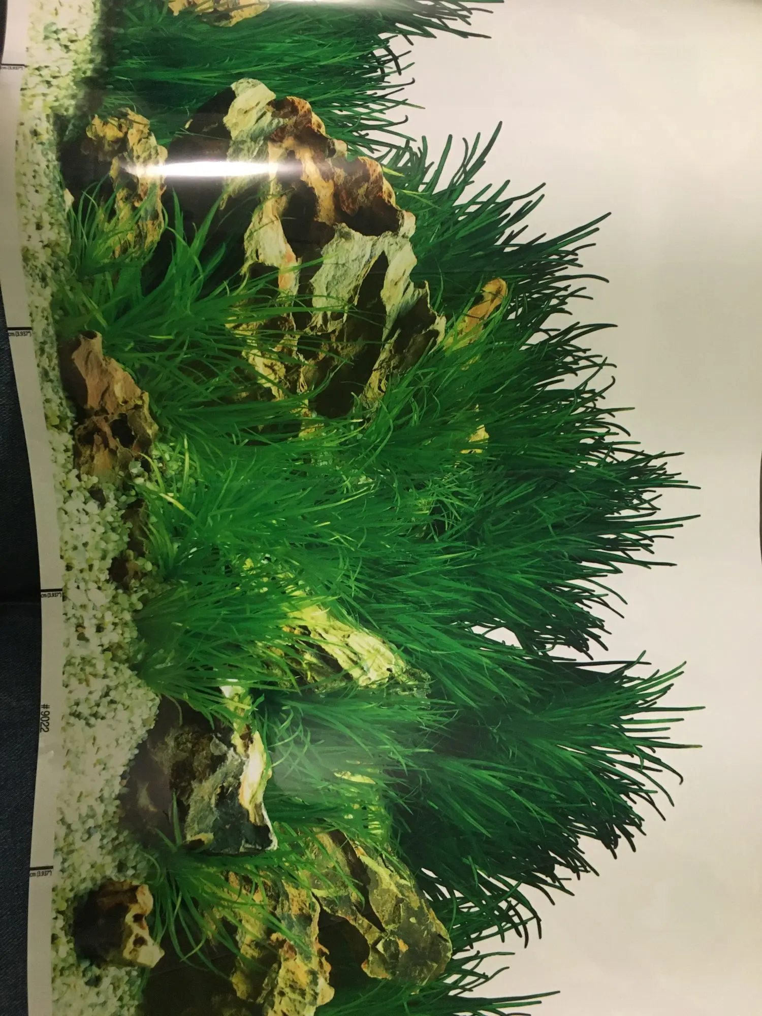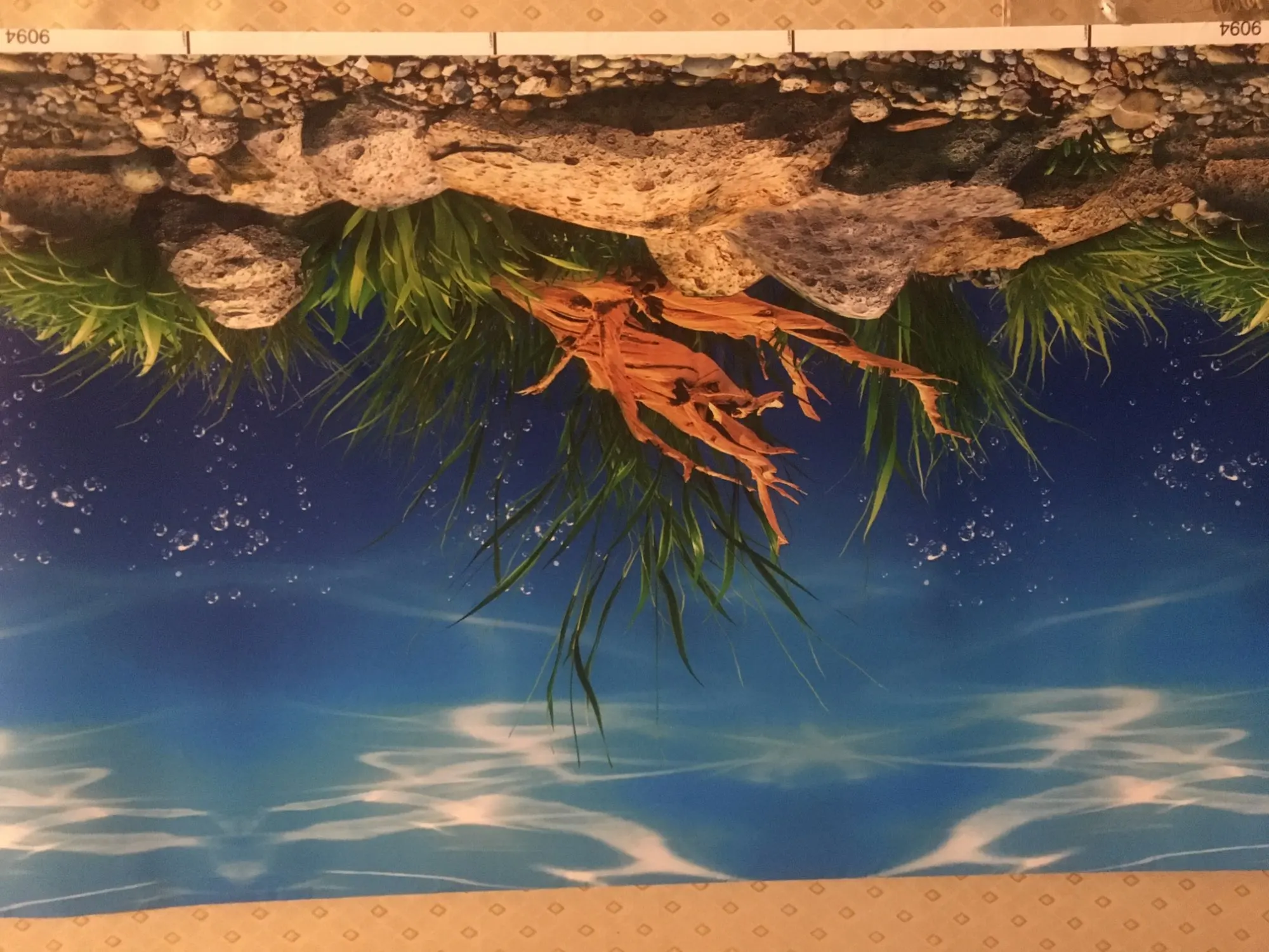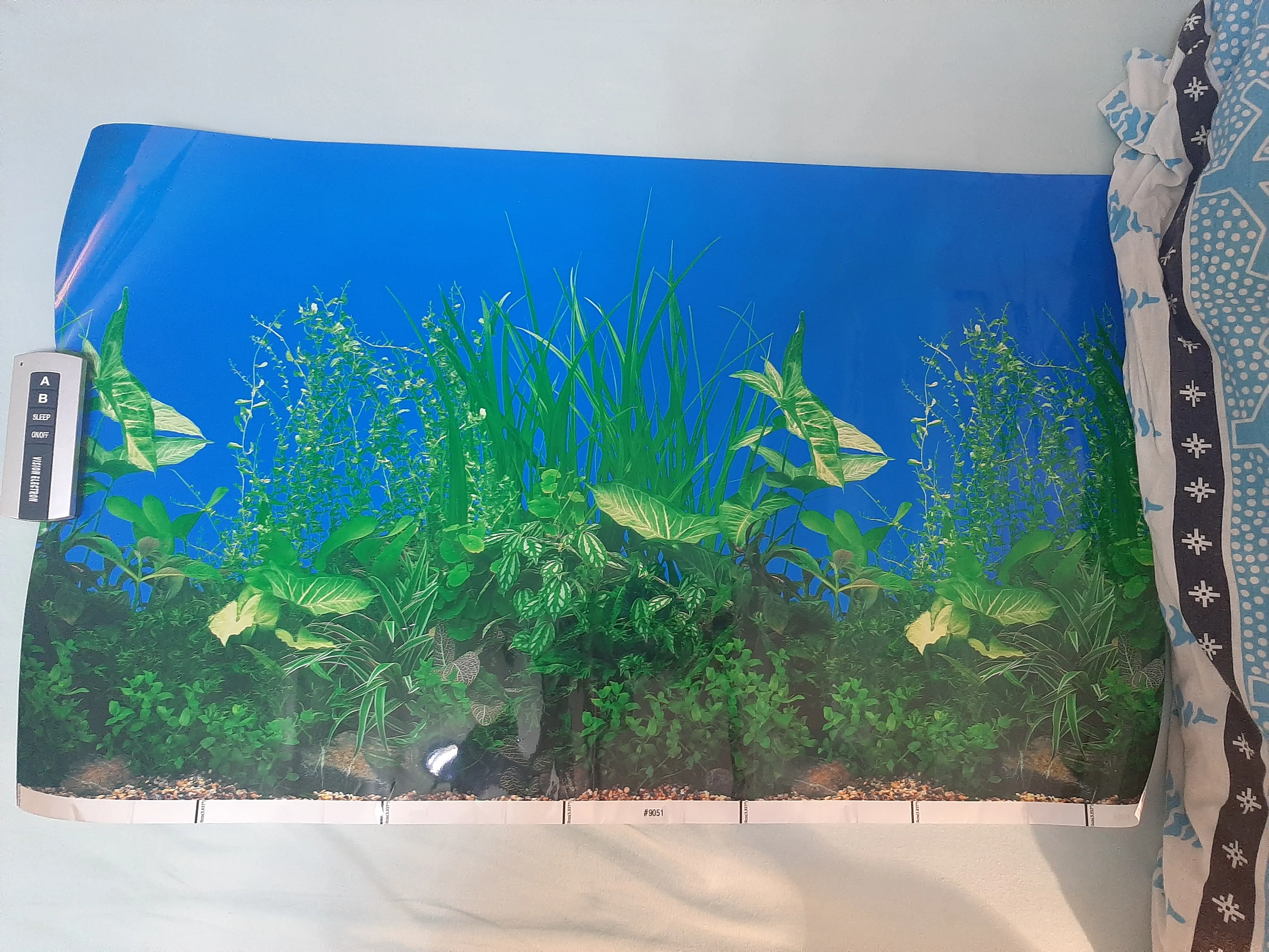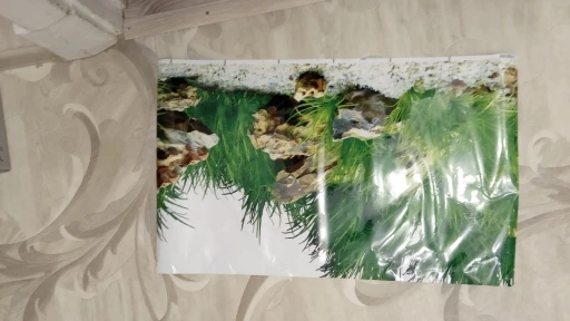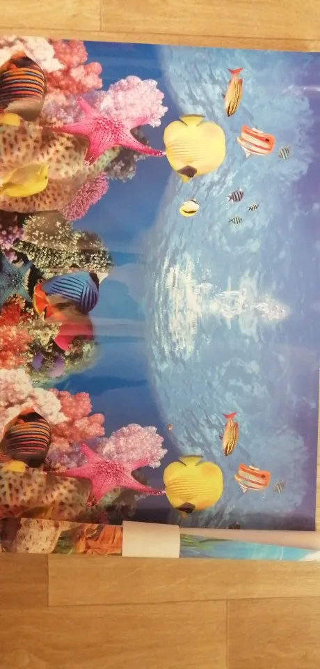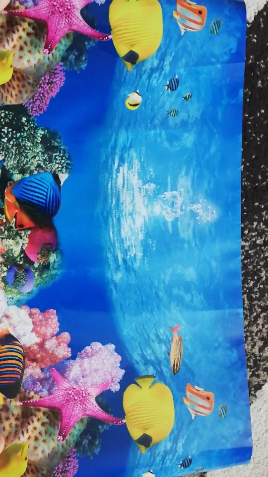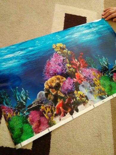 Красивый фон, хорошо упаковали и не помялся ни чуть. Двухсторонний. В комплекте 4 стикера скотча для приклеивания к аквариуму. Спасибо продавцу. Рекомендую к покупке.