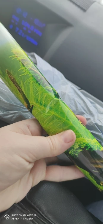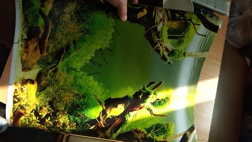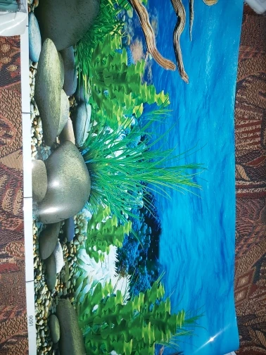 в пути фон помяли, складка получается прямо посередине, из-за этого фон не прилегает к стеклу и это очень видно. мне не понравилось,сняла и опять поставила свой просто чёрный фон. Мне кажется моему аквариуму просто и не нужен этот фон, так что это дело вкуса. Благо не дорого...попробовала, не впечатлилась и забила первые два фото-с фоном, третье фото-родной, чёрный фон