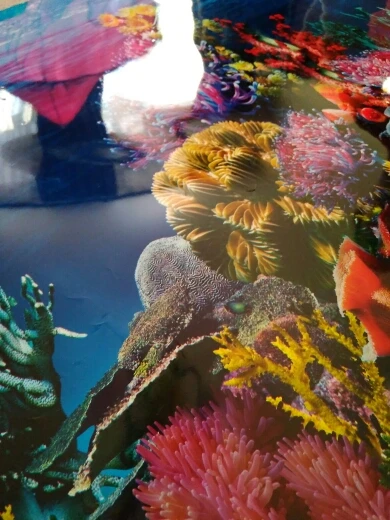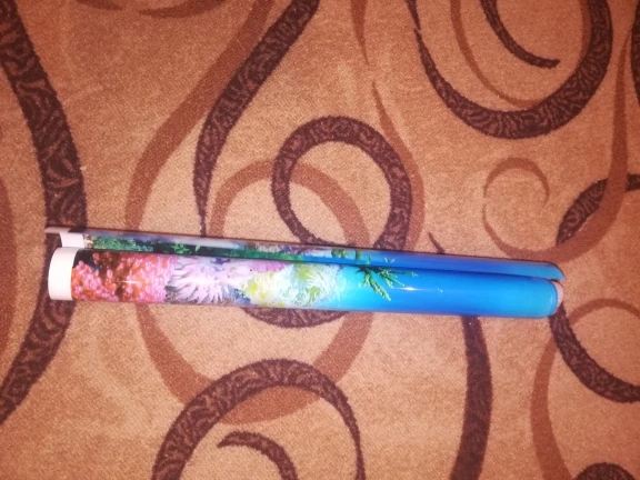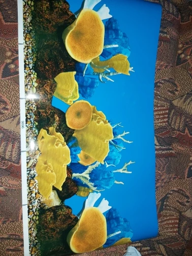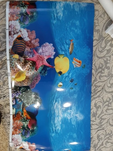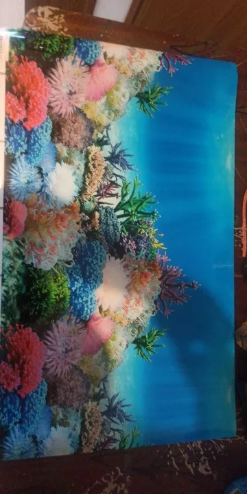 очень красивый фон для аквариума. упакован был хорошо, но всё равно при транспортировке немного помялся. впоследствии разгладился. темный фон придает шикарный вид, рыбки выглядят ярче. фото красивое, рыбки на рисунке как настоящие. доставлено за 3 недели, трек отслеживался