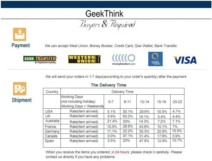 Если у вас есть problem_свяжитесь с нами, пожалуйста 1. Если у вас есть какие-либо вопросы или Вам нужна помощь, пожалуйста, свяжитесь с нами! 2. Мы стараемся ответить как можно быстрее. Мы будем рады ответить на любой вопрос. Если у вас есть какие-либо вопросы, свяжитесь со мной. Доставка 1. Товары будут отправлены в течение 5 рабочих дней после подтверждения оплаты. 2. Пожалуйста, убедитесь, что ваш адрес правильный. 3. Иногда это может быть дольше из-за плохой погоды, траты времени на таможенное оформление. Поэтому наберитесь терпения если вы не получили товар вовремя. Если вы не получили товар в течение 60 дней, пожалуйста, свяжитесь с нами, и мы поможем вам отследить его. Информация о возврате товара 1. Мы надеемся что вы всегда довольны нашими товарами! 2. Если что-то не так, пожалуйста, свяжитесь с нами в первый раз, через онлайн-систему или по электронной почте в течение 3 дней после прибытия, лучше с фотографиями, чтобы четко показать проблему. 3. Если вы не на 100% удовлетворены качеством товара и вам необходимо вернуть или обменять, сделайте это в течение 7 дней после прибытия, и вы несете ответственность за стоимость доставки. Отзывы 1. Ваши отзывы очень важны для нас. 2. Пожалуйста, уделите несколько секунд, чтобы оставить отличные отзывы, если вы удовлетворены нашим продуктом и обслуживанием, спасибо! 3. Если у вас возникли проблемы при получении заказа, пожалуйста, свяжитесь с нами, мы решим все проблемы для вас! Спасибо! 4. Мы всегда предлагаем Вам самые низкие цены на лучшие товары и услуги.
