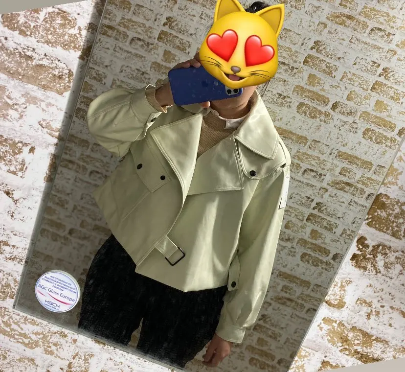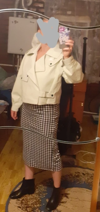 Размер С на мой 42 отлично сел, фасон оверсайз и можно свитер или толстовку надеть под куртку. Дефектов нет. Мой рост 162см, длина рукавов нормальная, но я все равно собиралась подкатывать, поэтому не особо важно. Всего одна застежка сбоку, ну и пуговица изнутри одна и все! Мерзлячкам не рекомендую. А так сидит норм! Тем кто хочет разнообразия и устал от косух подойдёт как альтернатива.