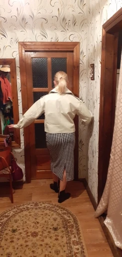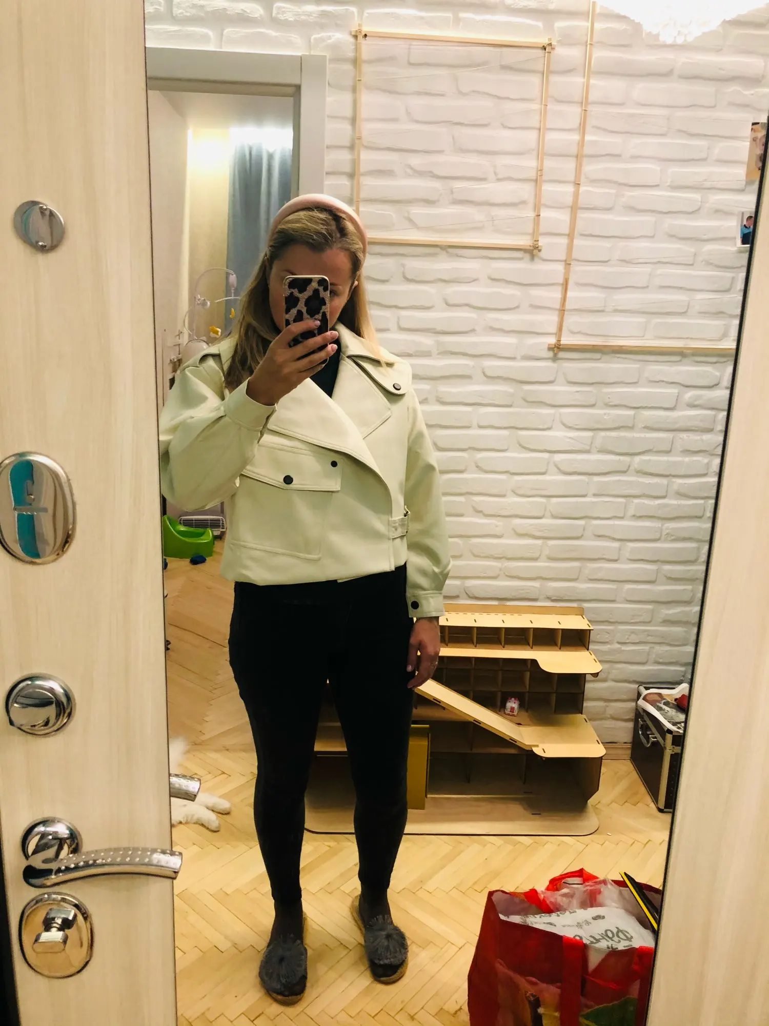 На параметры 78-63-87 и рост 157 размер S смотрится как оверсайз. Мне не очень привычно, не могу понять нравиться или нет. Качество кожзама на твёрдую троечку. Постороннего запаха нет. По длине, чуть выше поясницы.