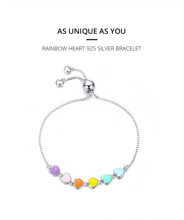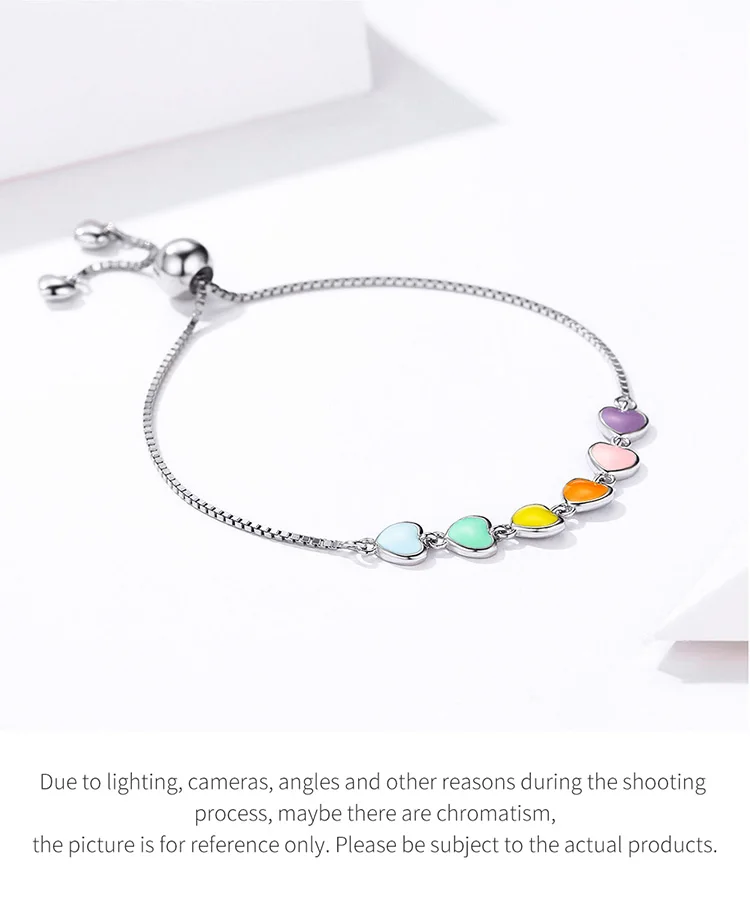 Браслет-цепочка женский из серебра 925 пробы, с эмалированным сердечком радужного цвета