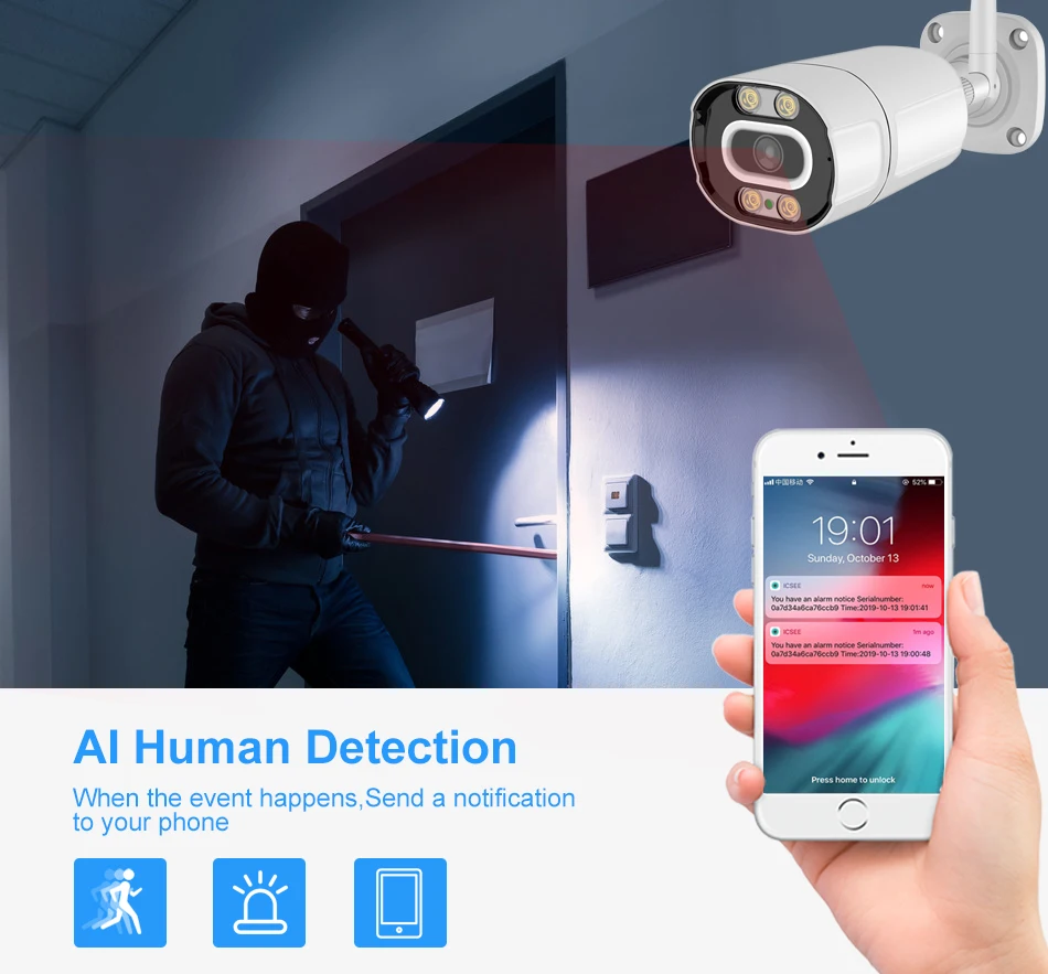 Обнаружение человека: только Обнаружено движение человека, уменьшает Ложные сообщения тревоги.Звуковой сигнал: когда кто-то ворвется в зону съемки, камера издаст звуковой сигналНастраиваемая Голосовая Сигнализация: разумно Настройте область сигнализации, которую вы хотите, голосовое оповещение.Полноцветное ночное видение: камера может быть настроена на полноцветное ночное видение, как дневное видение.