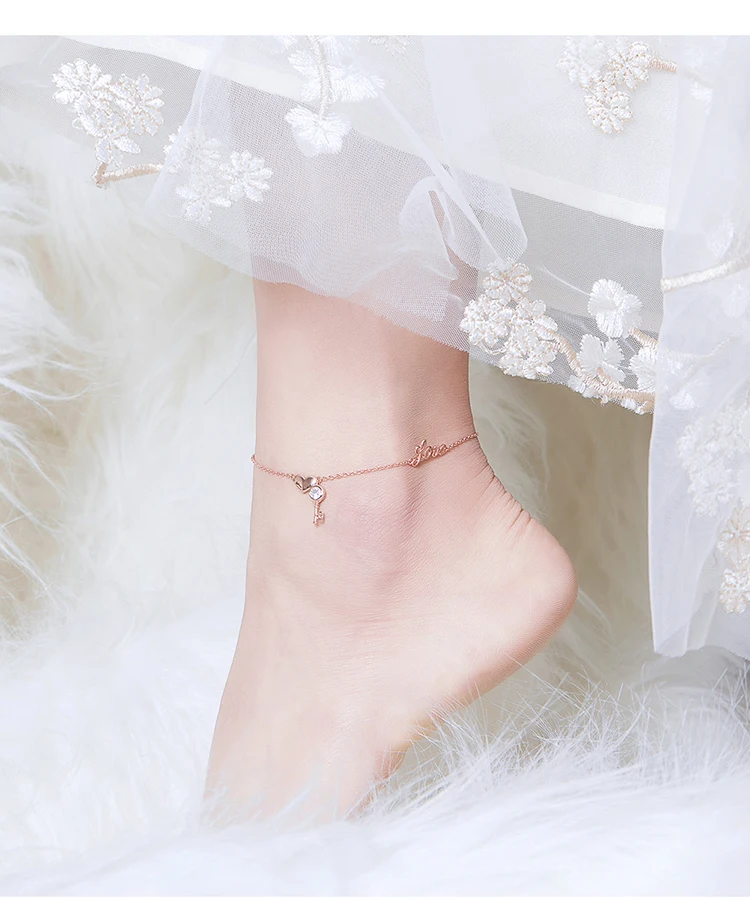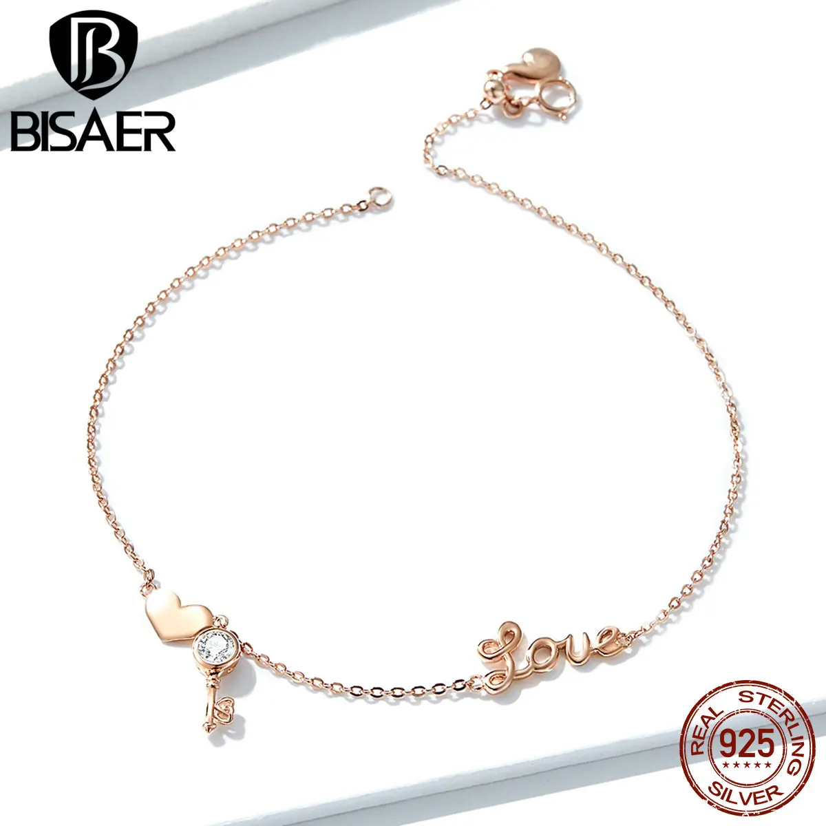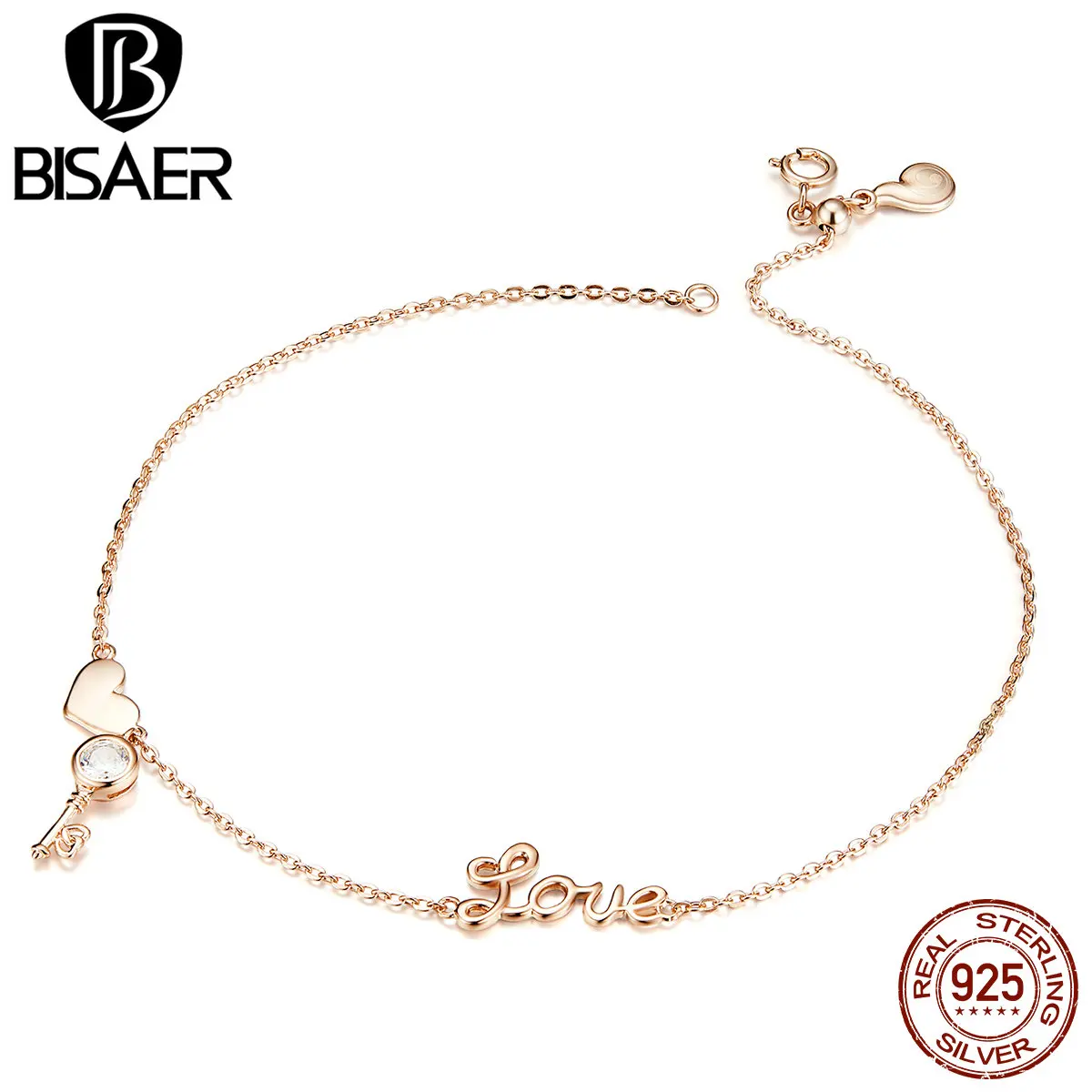 Серебряные ножные браслеты BISAER 925 пробы Серебряное сердце, для влюбленных ключ Форма 23 см ножные браслеты с цепочкой для Для женщин Стерлинговое Серебряные ювелирные изделия EFT001