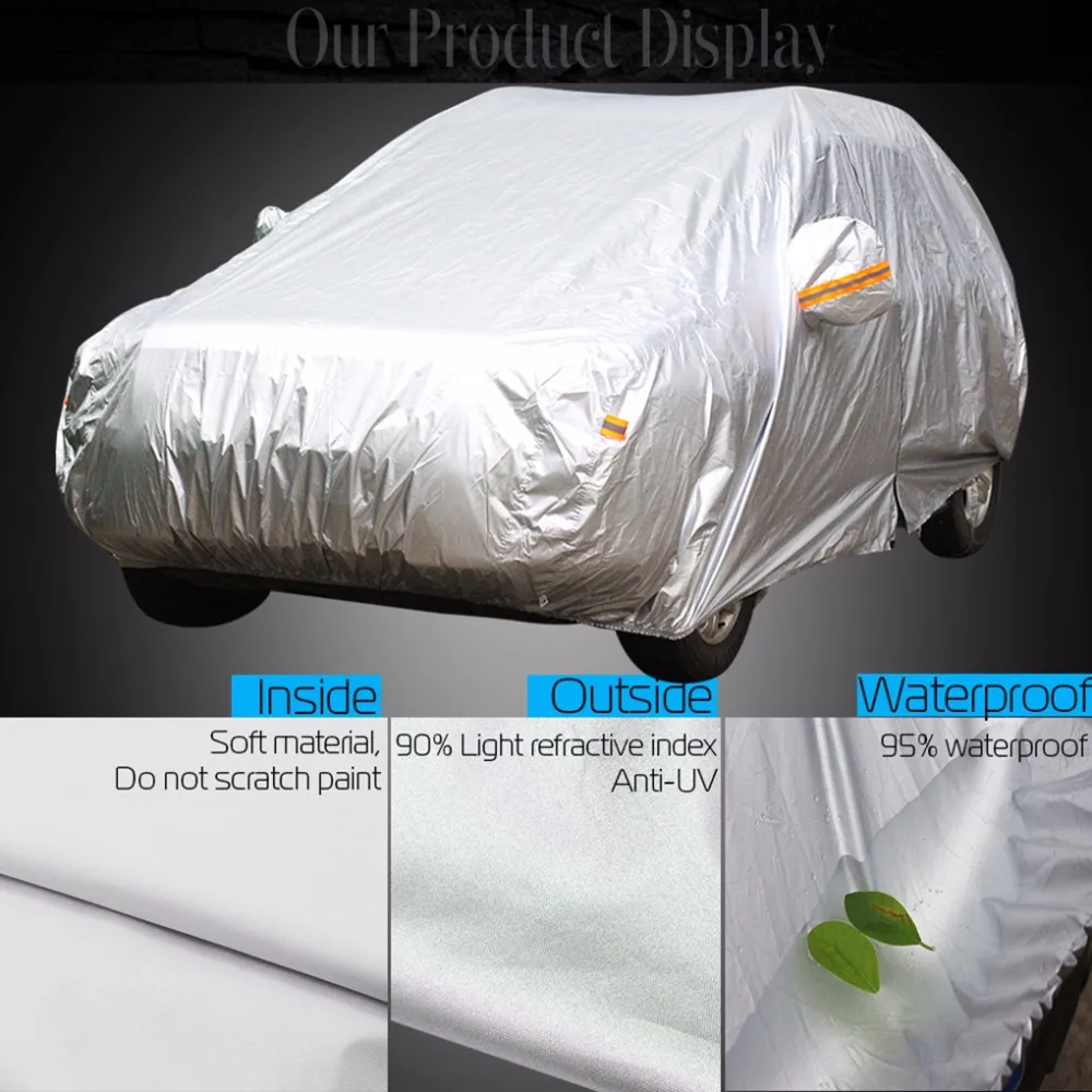 -Чехол для автомобиля имеет многофункциональный и портативный дизайн, он имеет предупреждающую отражающую ленту, ветрозащитную пряжку, открывающую дверную молнию и сумку для хранения;